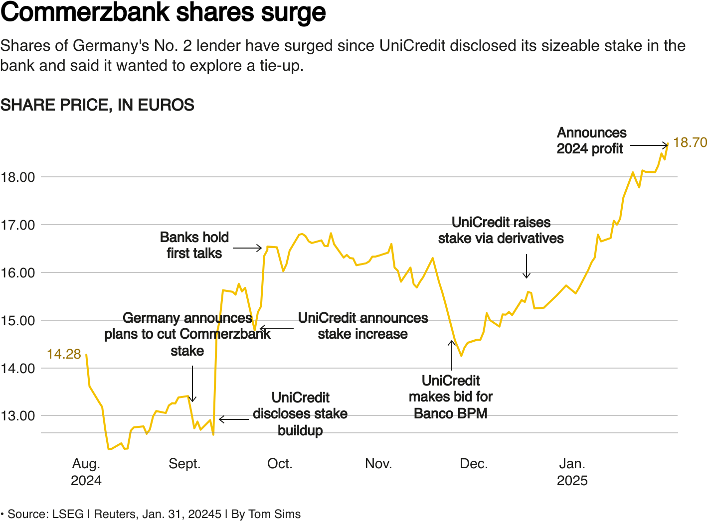 去年,UniCredit揭示了对Commerzbank的重要股份收购,并开始施压以实现两家机构之间的合并。德国银行试图自我防卫并保持独立,抵制意大利银行的“敌意”接触。