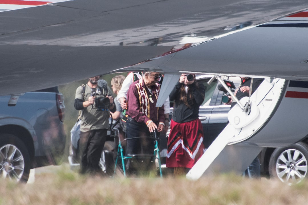 美国土著活动家伦纳德·佩尔提尔(使用助行器),因谋杀两名FBI特工而被监禁大部分时间,在佛罗里达州利斯堡机场登上飞机,此前他被释放,前总统乔·拜登将他的刑期减为监视居住,…阅读更多拜登在任期最后一天批准的减刑,长期以来受到FBI的反对。前局长克里斯托弗·雷称佩尔提尔为“无悔的杀手”。