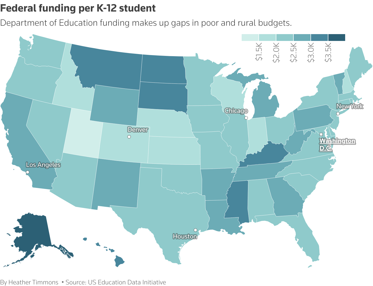 根据教育数据倡议编制的数据,阿拉斯加、北达科他州、蒙大拿州、肯塔基州和南达科他州是联邦资金的主要接受者,按每名K-12学生计算。