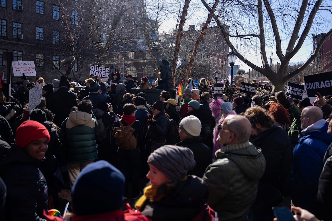第1项,共2项 人们在美国纽约市的石墙酒吧和石墙国家纪念碑抗议美国总统唐纳德·特朗普政府限制跨性别权利的举措,时间为2025年2月14日。路透社/大卫·“迪”·德尔加多/档案照片
