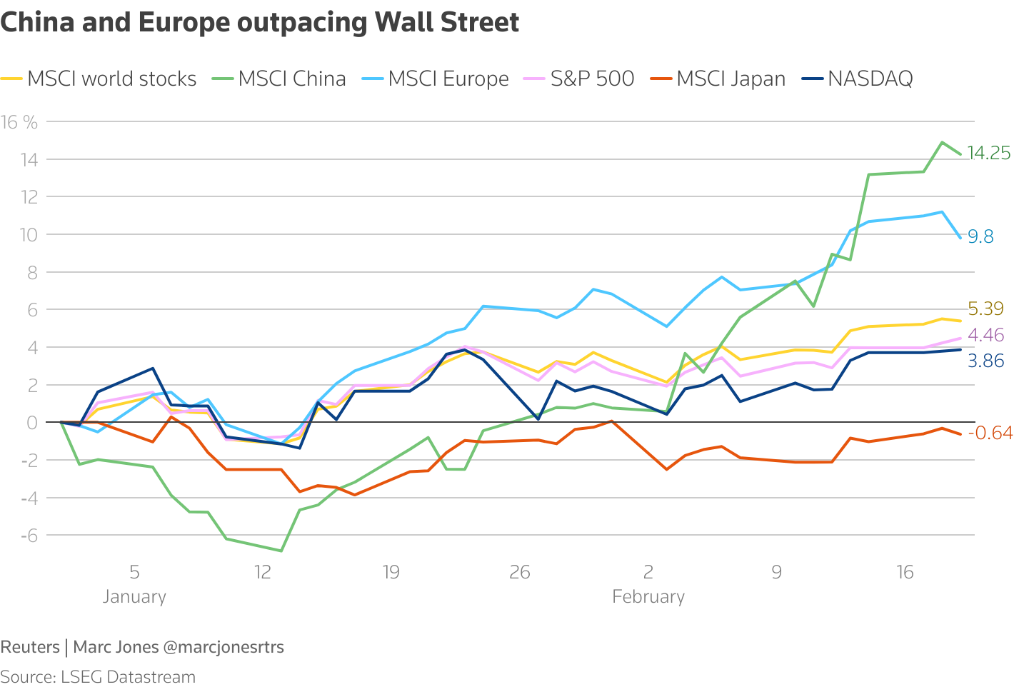 纽约/伦敦,2月20日(路透社) - 全球股市下跌,黄金价格在周四上涨,交易员们纪念美国总统唐纳德·特朗普回到白宫一个月,以及新冠病毒首次冲击全球市场五周年。