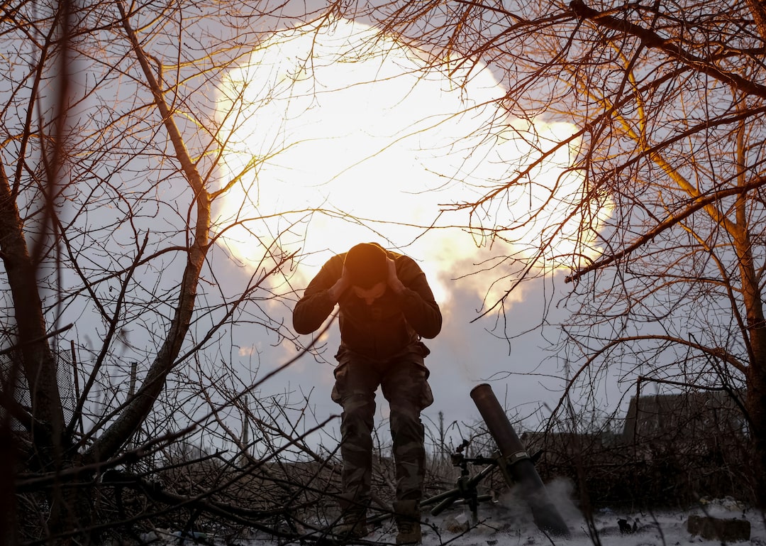 项目 1 的 2 一名乌克兰武装部队第57摩托化步兵旅的军人在前线向俄罗斯军队发射120毫米迫击炮后作出反应,正值俄罗斯对乌克兰的攻击,在乌克兰哈尔科夫地区沃夫昌斯克镇附近,2025年1月16日。路透社/索非亚·加蒂洛娃/档案照片