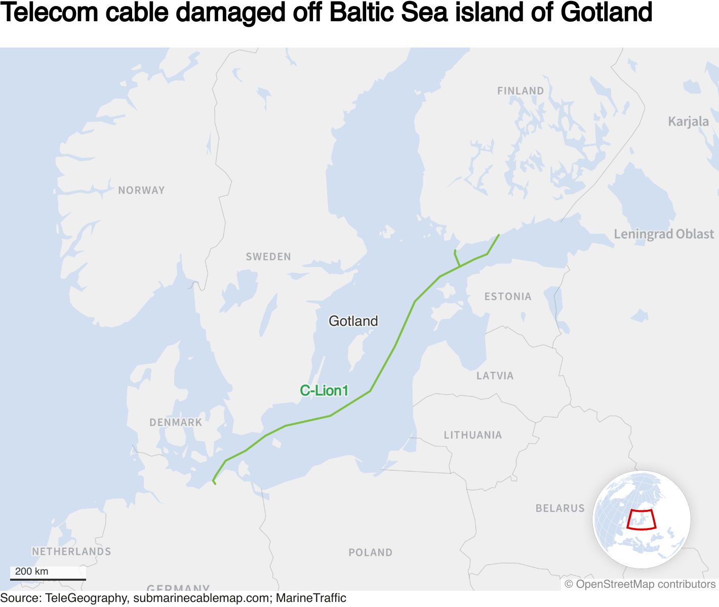 一张显示波罗的海的地图,标示出在瑞典哥特兰岛附近受损的光纤电信电缆。