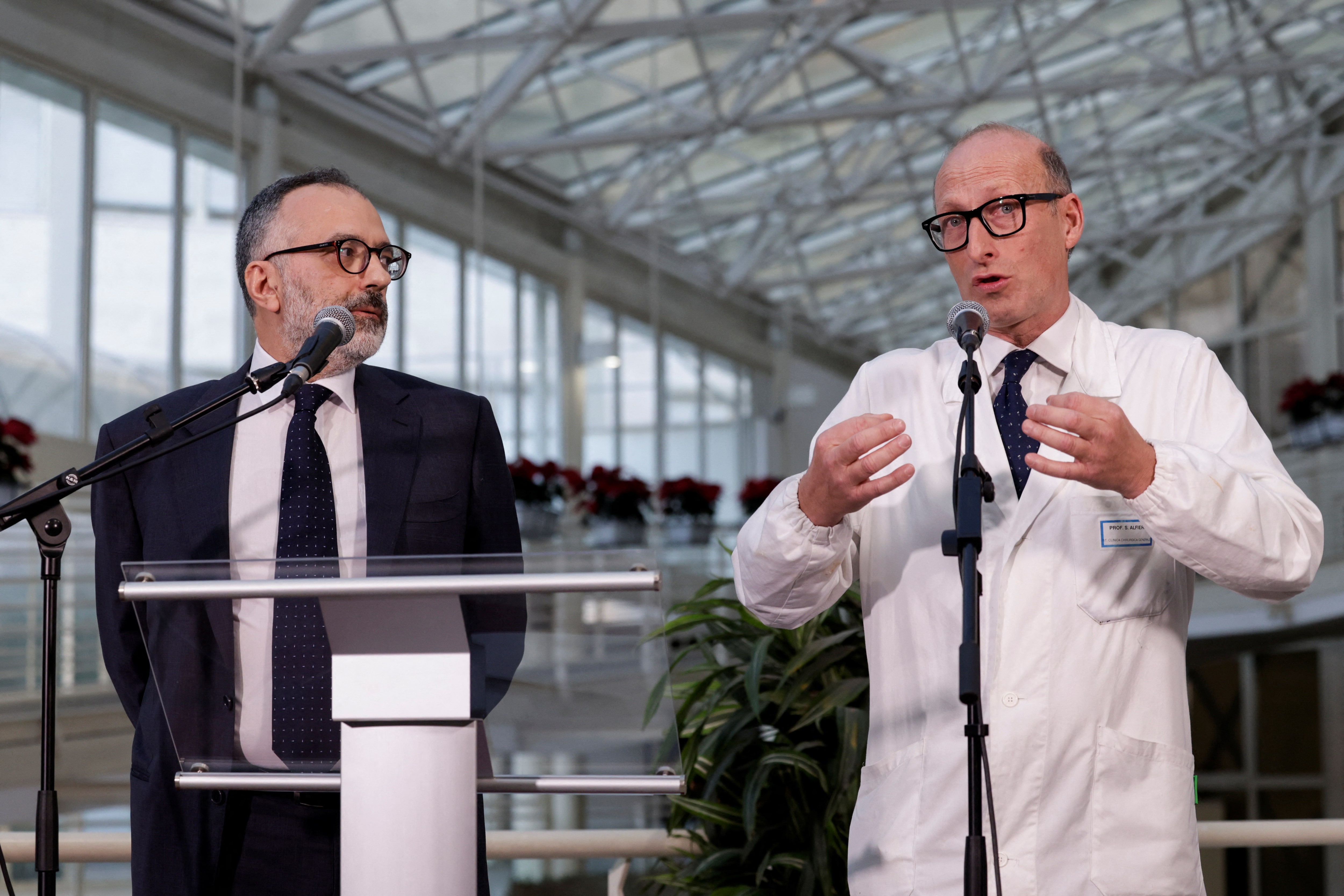 塞尔吉奥·阿尔菲耶里和路易吉·卡博内在意大利罗马的杰梅利医院参加新闻发布会,教皇方济各正在该医院接受治疗,时间是2025年2月21日。路透社/雷莫·卡西利罗马,2月21日(路透社) - 教皇方济各因双肺炎在医院接受治疗,虽然没有生命危险,但尚未痊愈,他的一位医生塞尔吉奥·阿尔菲耶里在周五表示。