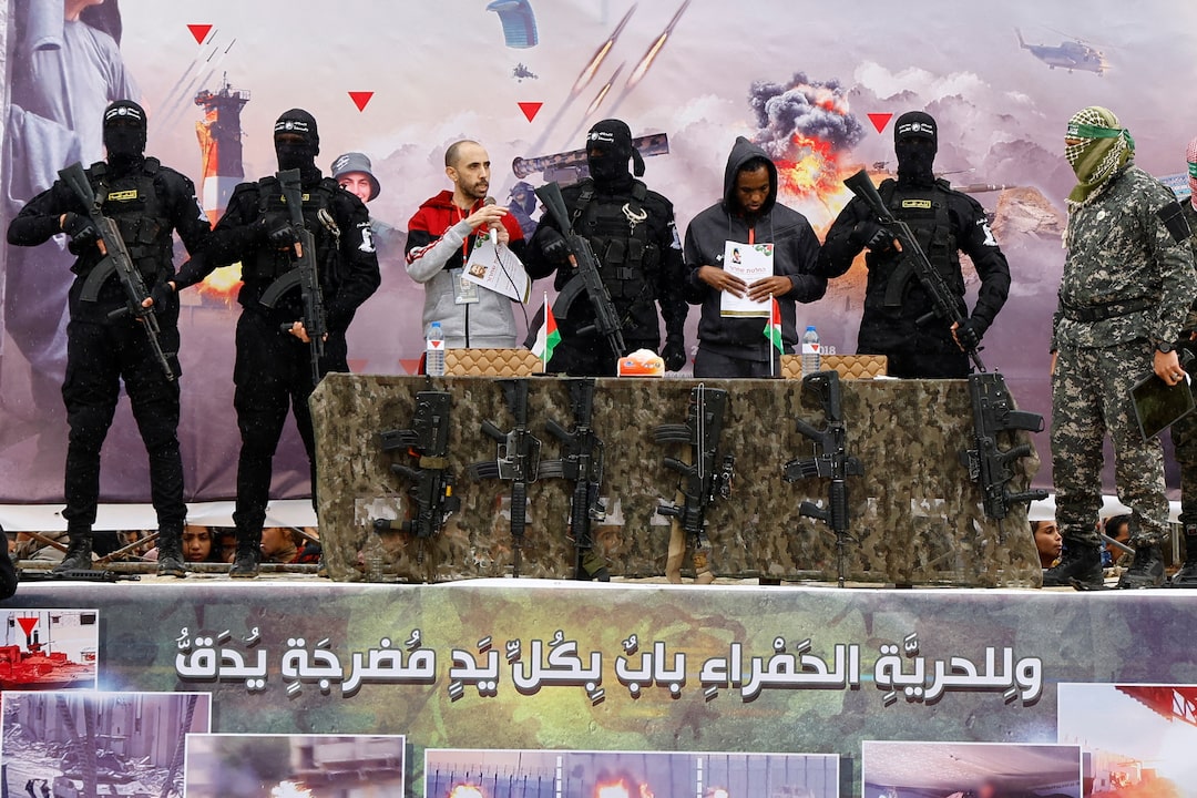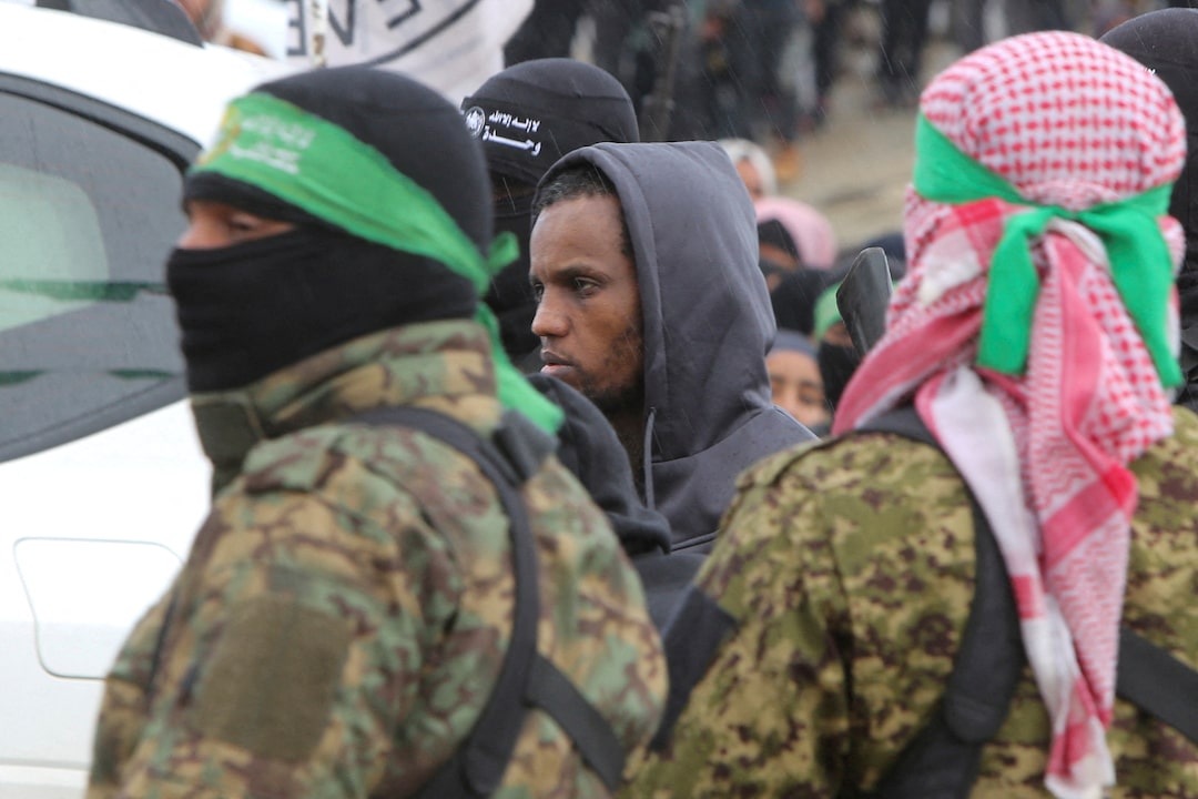 第1项,共4项 阿维拉·门吉斯图,十年前进入加沙并一直被拘留,作为停火和哈马斯与以色列之间人质-囚犯交换协议的一部分,被巴勒斯坦哈马斯武装分子护送,在2025年2月22日的加沙南部拉法。