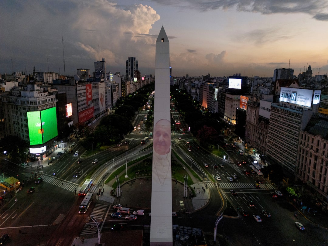 在布宜诺斯艾利斯,周五到周一的夜晚,教皇的照片和“城市为你祈祷”的短语正在著名的方尖碑上投影。