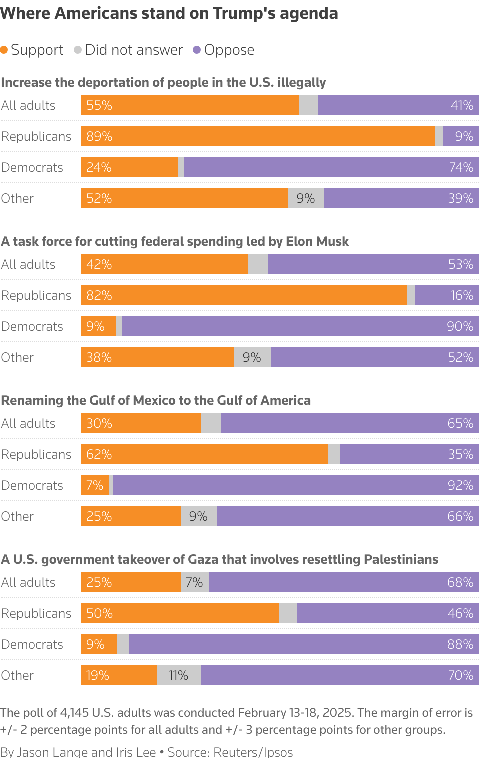 穆斯克迄今为止的努力削减了数百个相对较小的合同,据称为美国纳税人节省了85亿美元,这只是年度联邦预算的一小部分。同样比例的核心MAGA选民认为增加对非法移民的驱逐是投票的重要动机。这是去年特朗普总统竞选的核心问题。在路透社/Ipsos的调查中,超过一半的受访者——55%——支持增加驱逐,而41%的人表示反对。但对特朗普在移民问题上的表现,只有不到一半的受访者表示认可——47%。