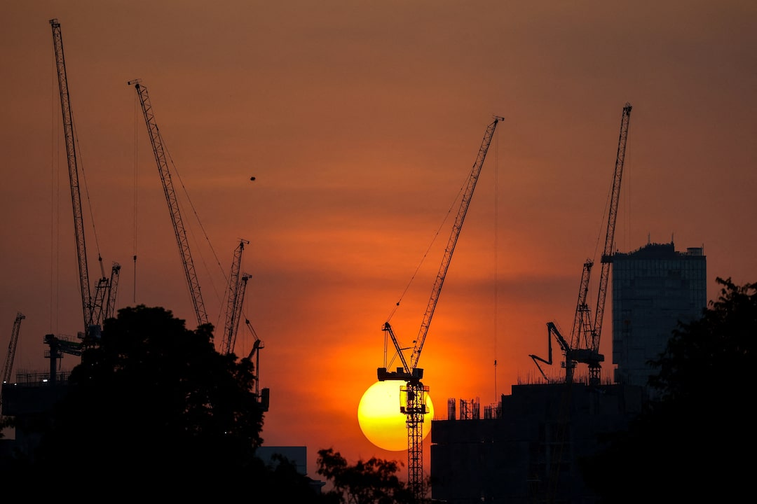 项目 1 共 2 在泰国曼谷,2022年11月8日,太阳在一台建筑起重机后面落下。路透社/Athit Perawongmetha/档案照片