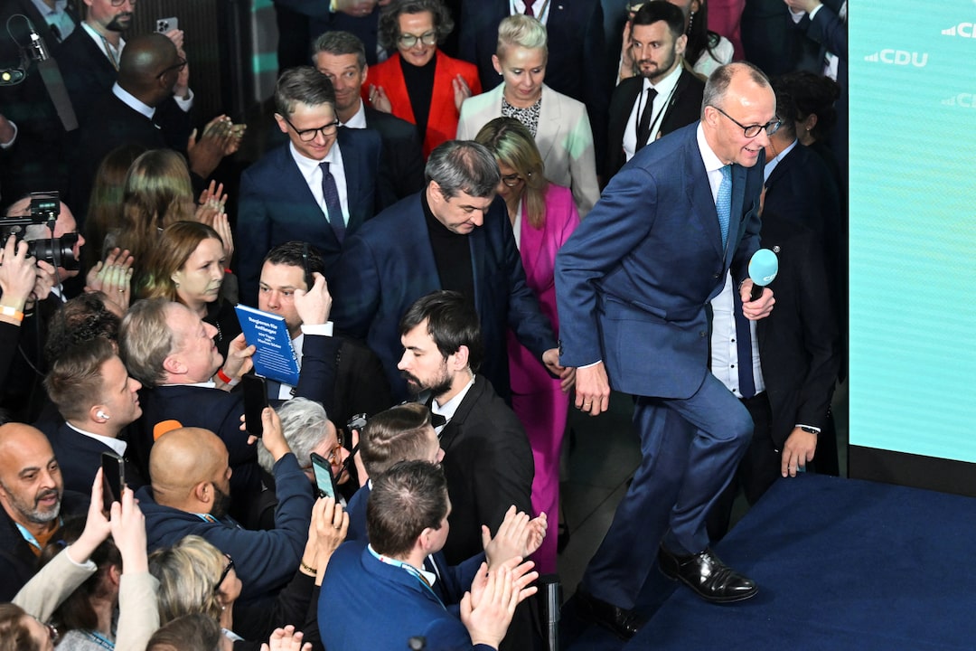 第1项,共8项 德国保守派总理候选人及基督教民主联盟(CDU)党首弗里德里希·梅茨在2025年德国大选的出口民调结果公布后作出反应,地点在德国柏林,日期为2025年2月23日。路透社/安吉丽卡·瓦尔穆斯