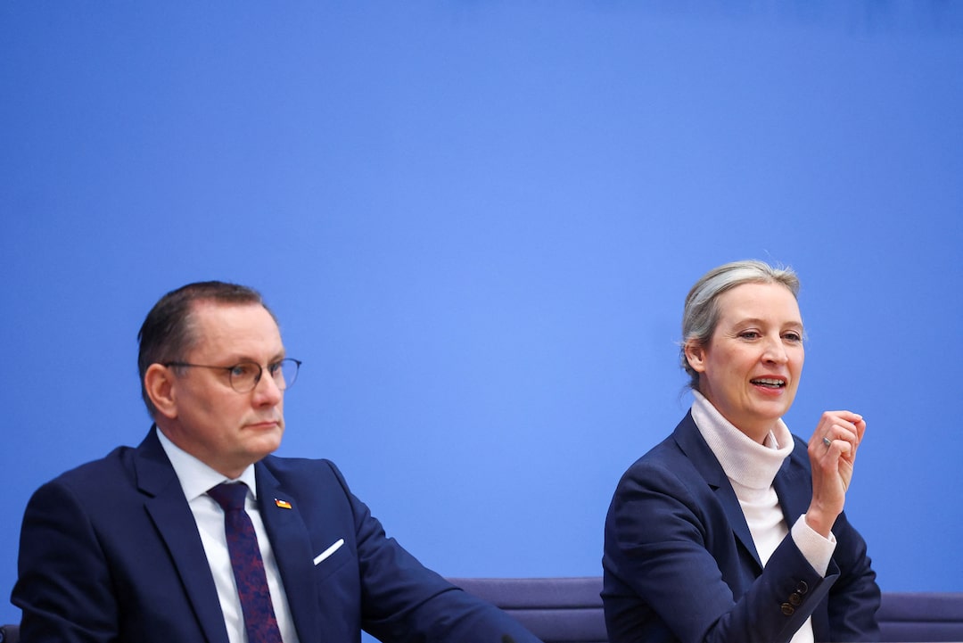 两名极右翼德国选择党(AfD)共同领导人爱丽丝·韦德尔和蒂诺·克鲁帕拉在2025年2月24日德国柏林的德国大选后召开新闻发布会。路透社/莉西·尼斯纳