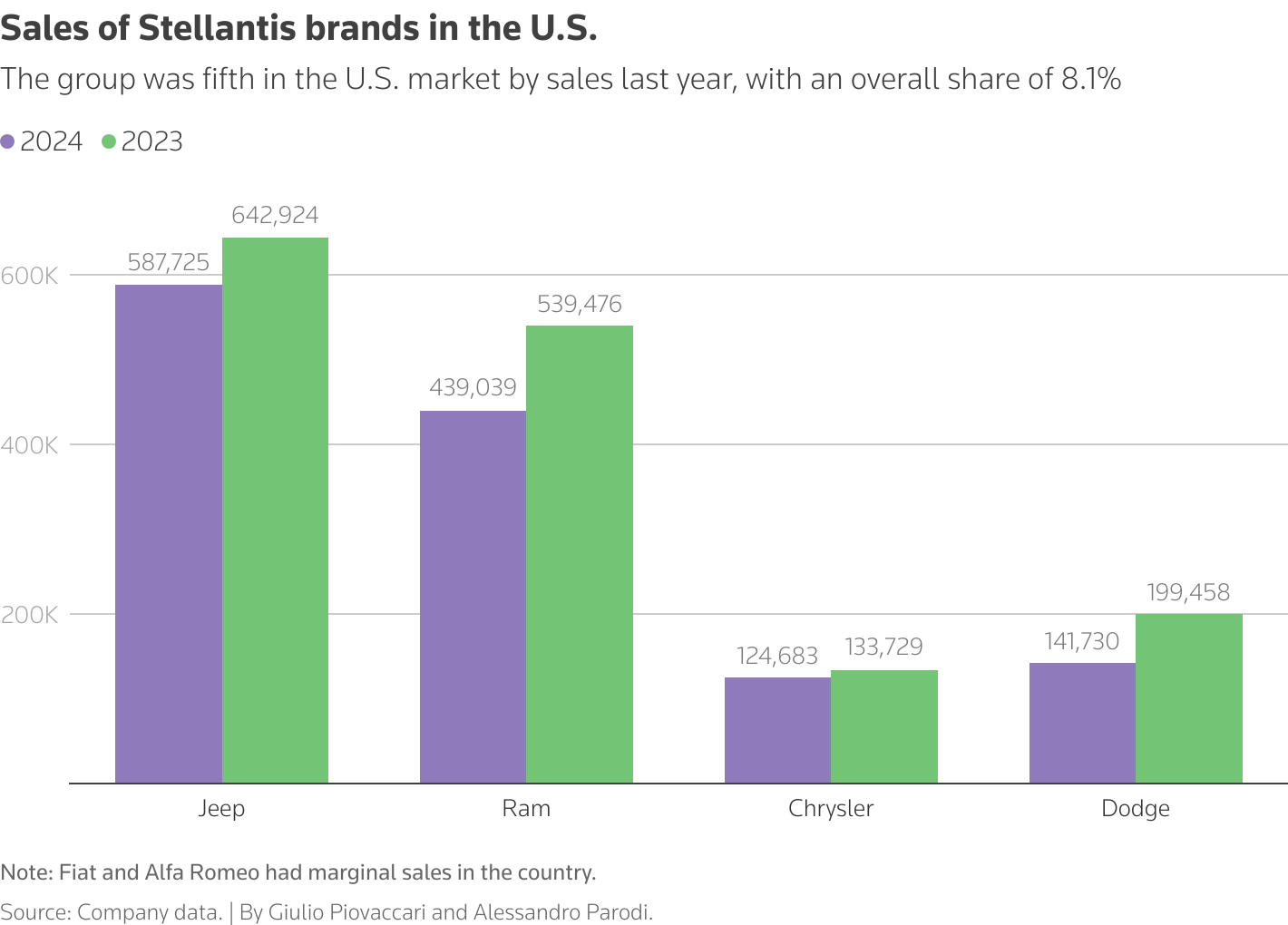 根据路透社的计算,2024年Jeep占Stellantis全球销量的至少15%,而Chrysler和Dodge各占约3%。