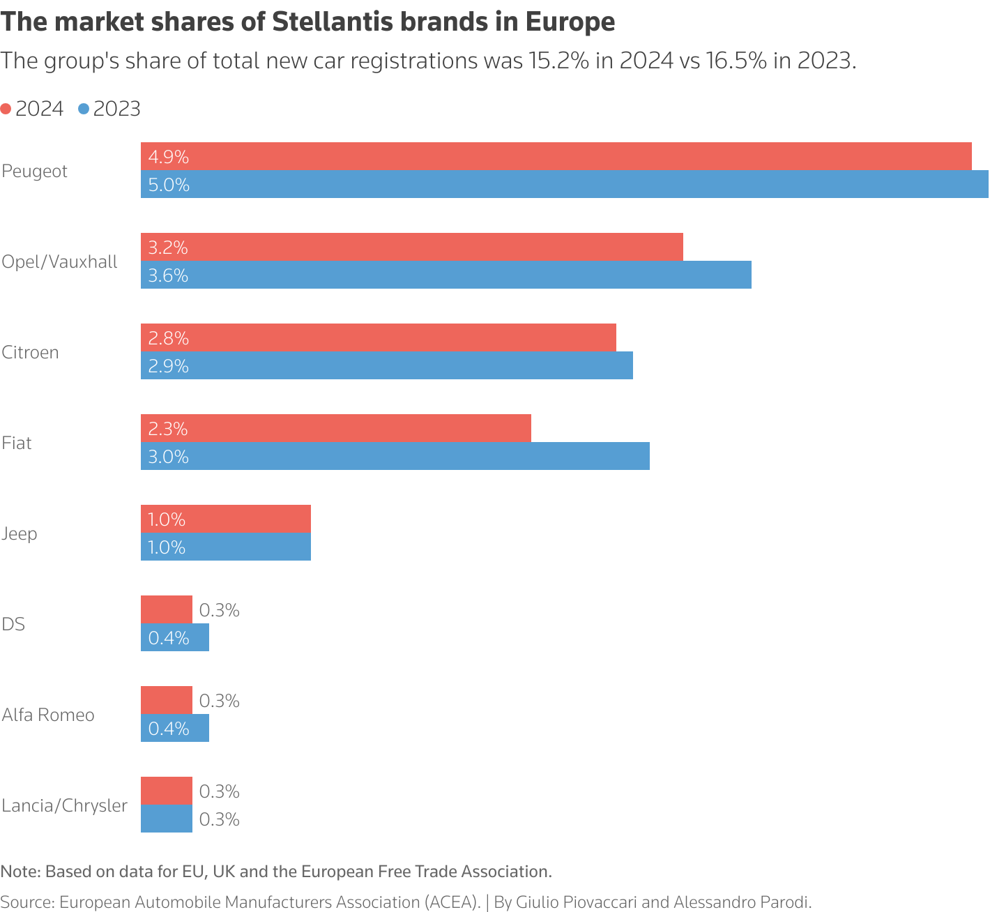 例如,在欧洲,斯特兰蒂斯是仅次于大众汽车的第二大汽车制造商,其畅销品牌标致去年仅占市场份额的4.9%,在整体排名中位列第八。