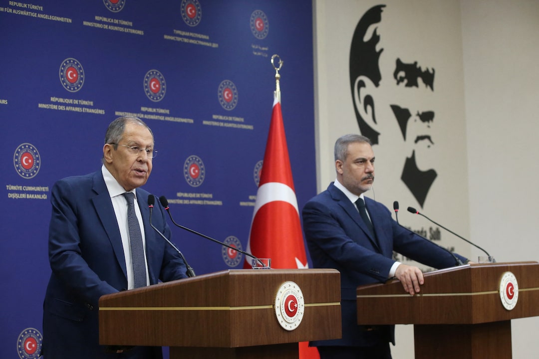 第1项,共4项 土耳其总统雷杰普·塔伊普·埃尔多安在土耳其安卡拉的总统府与俄罗斯外长谢尔盖·拉夫罗夫会面,土耳其外长哈坎·菲丹陪同,时间为2025年2月24日。穆拉特·切廷穆赫达尔/PPO/通过路透社提供
