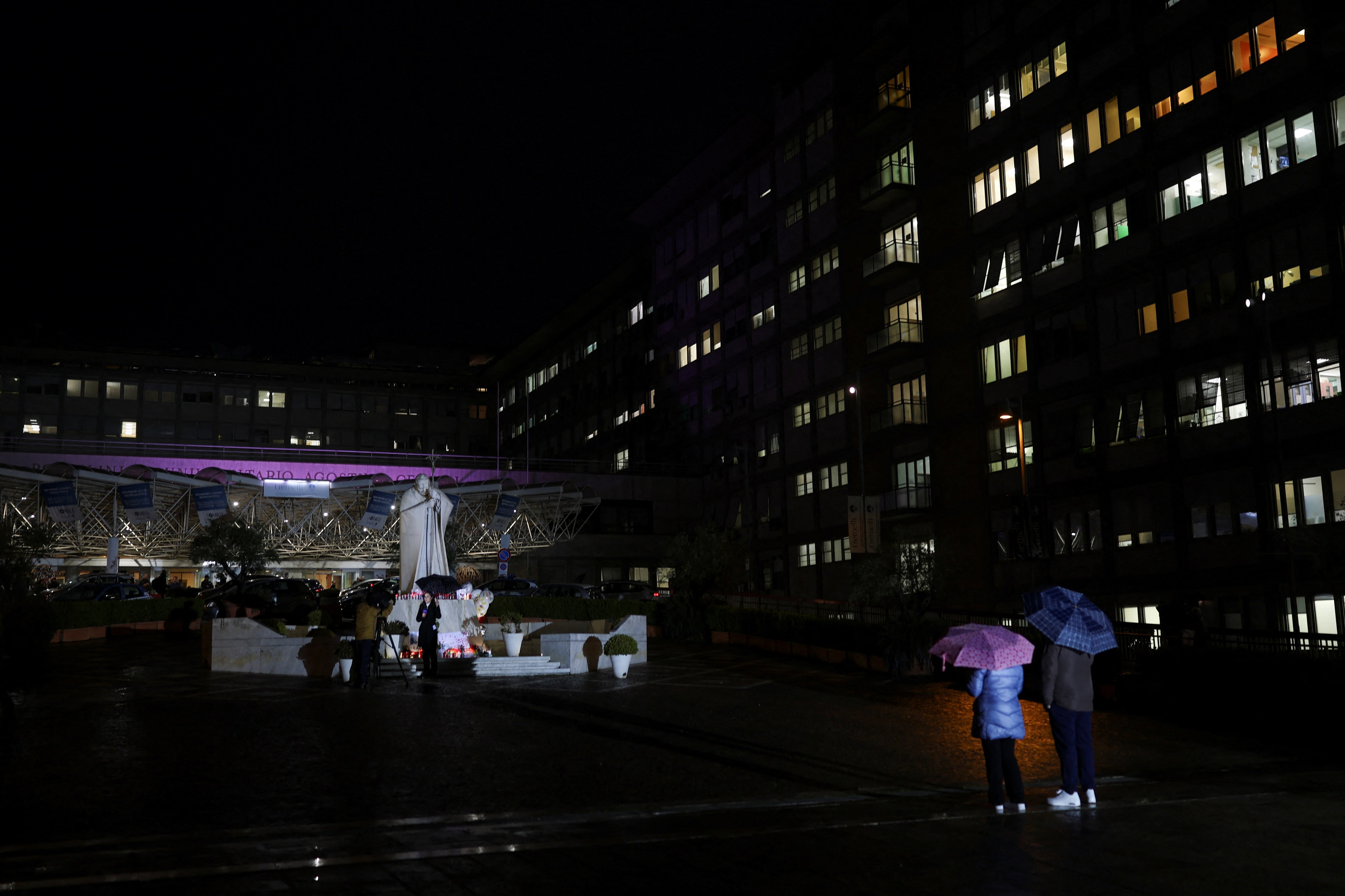 人们站在意大利罗马的杰梅利医院外,已故教皇约翰·保罗二世的雕像旁,教皇方济各因治疗而住院,2025年2月24日。路透社/汉娜·麦凯梵蒂冈,2月24日(路透社) - 梵蒂冈在周一的医疗更新中表示,教皇方济各的状况略有改善,并补充说他的“轻微”肾脏问题并不令人担忧。