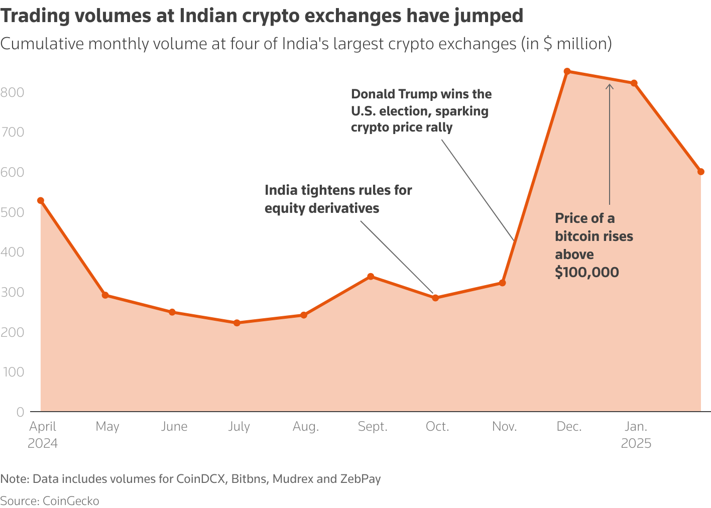 许多年轻的印度人正在涉足加密交易,以补充他们在这个世界上人口最多的国家的常规收入,在这里,工作和薪资增长一直滞后世界领先的经济增长。根据一份政府报告,近三分之二的14亿人口年龄在35岁以下。从股票和衍生品,他们现在正转向加密资产,其价格在美国总统唐纳德·特朗普在11月的选举胜利后飙升,这次胜利承诺了对该资产更宽松的监管制度。“在基层有很多好奇心……尤其是特朗普成为美国总统后,加密货币的整体氛围在全球范围内发生了变化,”印度加密交易所Mudrex的联合创始人Edul Patel说。