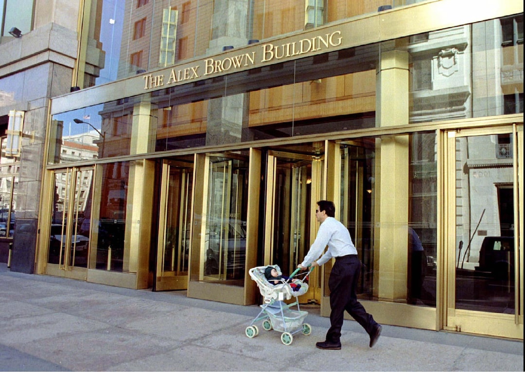 项目 1 共 4 项 一名男子推着婴儿车经过位于巴尔的摩市中心南街的零售经纪公司 Alex. Brown 办公室,日期为 4 月 7 日。美国银行公司 Bankers Trust New York Corp 和美国最古老的投资公司 Alex. Brown 于 4 月 6 日表示,他们已签署了一项价值约 1 美元的股票交换合并的最终协议。