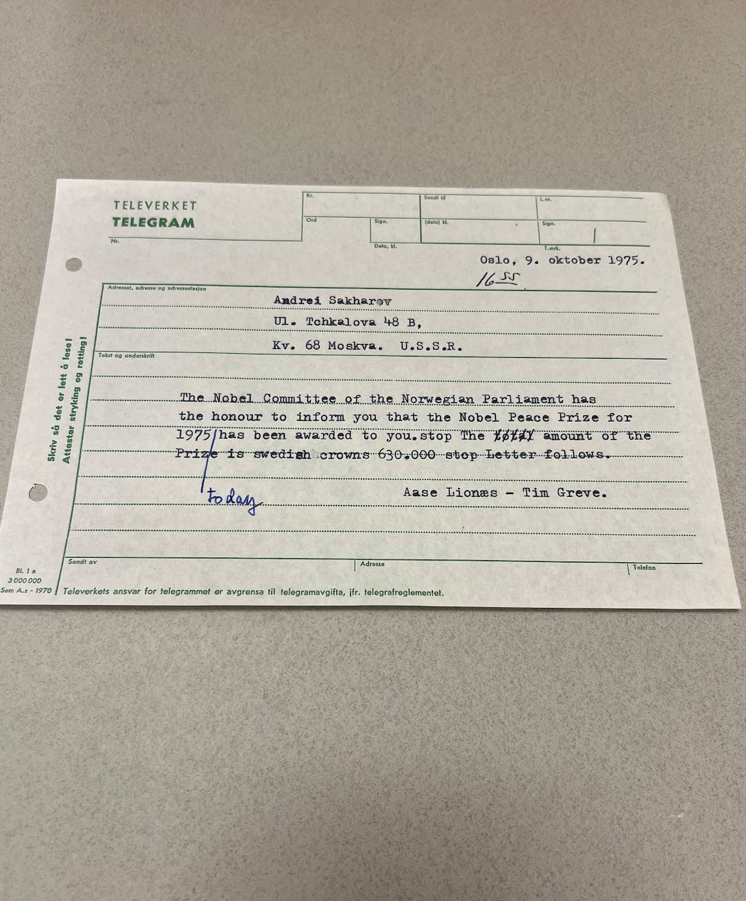 “是萨哈罗夫,他问是否可以在一点钟之前来大使馆,”朗格在给奥斯陆外交部的备忘录中写道。“他要求有人在外面接他,以防他被阻止进入。”