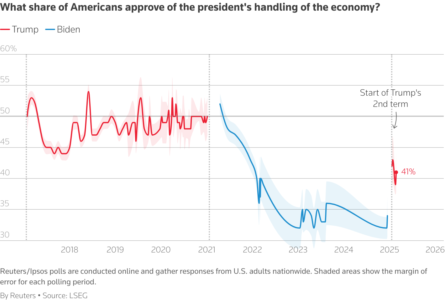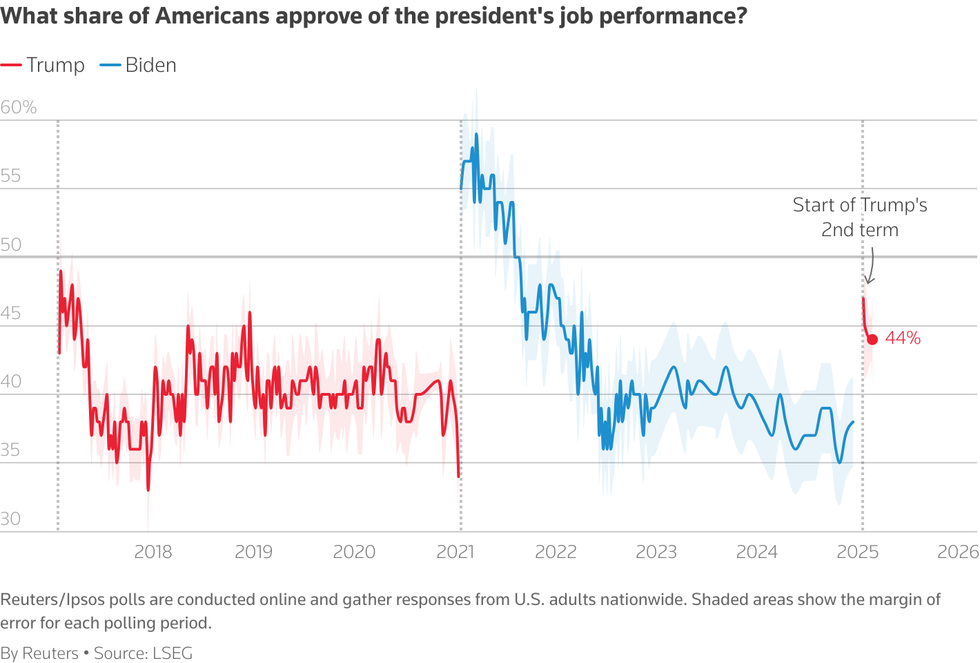 到目前为止,公众对特朗普的工作表现的支持率仍高于他2017-2021年第一任期的大多数时间,也高于他的前任,民主党人乔·拜登在其四年任期内的支持率。