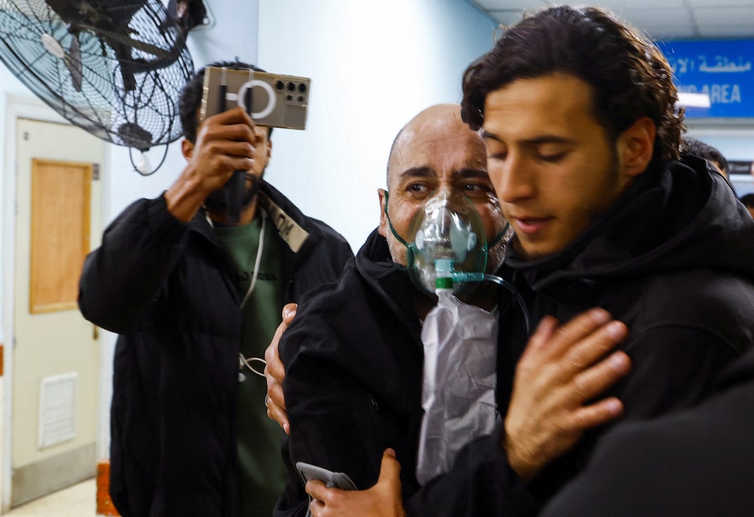 周四早些时候,救护车抵达位于加沙南部的哈农医院,运送被释放的巴勒斯坦人,他们将接受医疗检查。