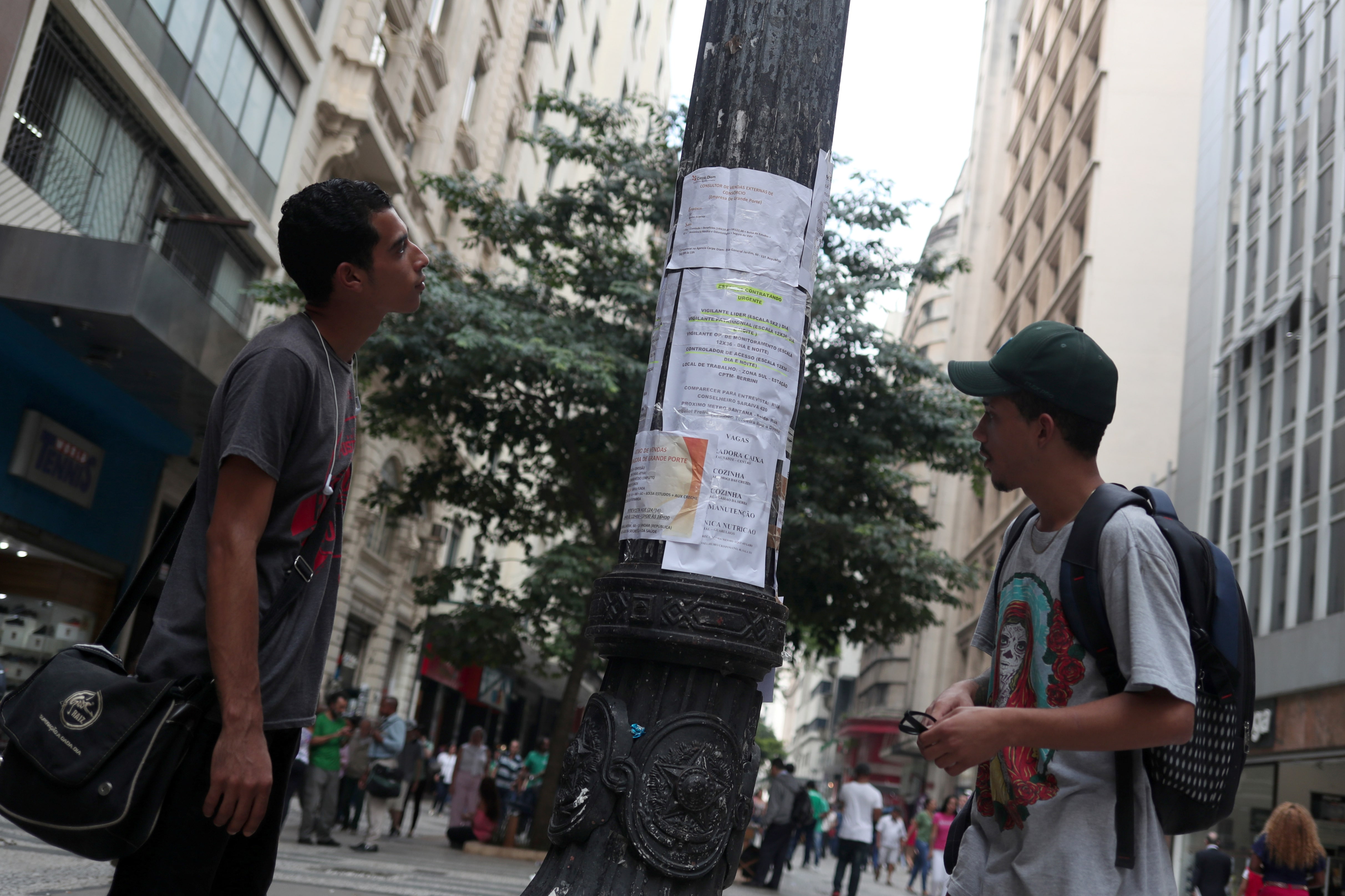 年轻人在圣保罗市中心查看招聘广告