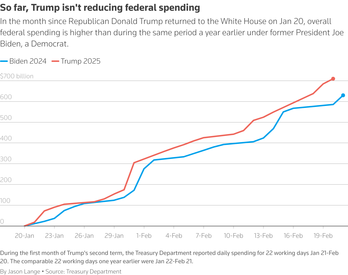 自1月20日共和党人唐纳德·特朗普重返白宫以来的一个月,整体联邦支出高于去年同一时期民主党前总统乔·拜登执政时的水平。