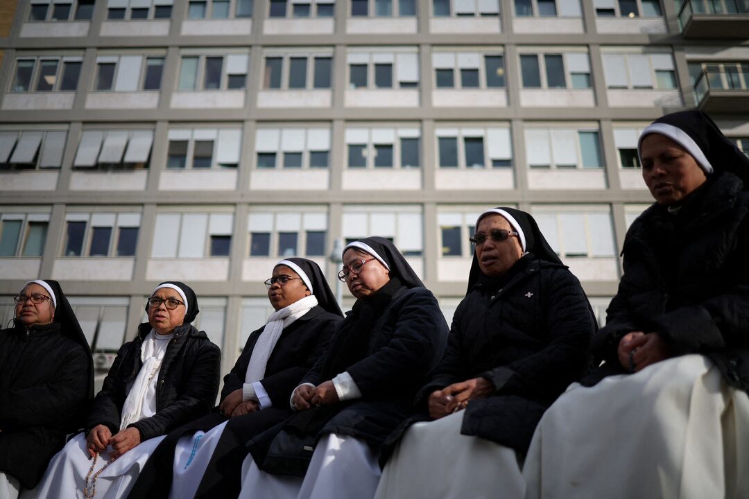 第1项,共6项 一些修女在罗马的杰梅利医院外为已故教皇约翰·保罗二世的雕像祈祷,教皇方济各因接受治疗而住院。2025年2月27日。路透社/古列尔莫·曼贾帕内