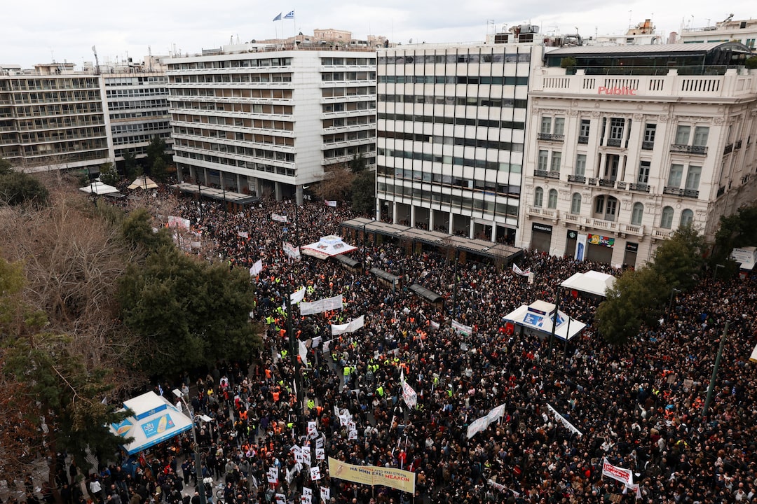 第21项中的第1项 无人机视角显示人们在希腊议会前聚集,进行抗议,纪念该国最严重铁路灾难的两周年,同时调查仍在继续,地点在希腊雅典,2025年2月28日。Eurokinissi通过路透社