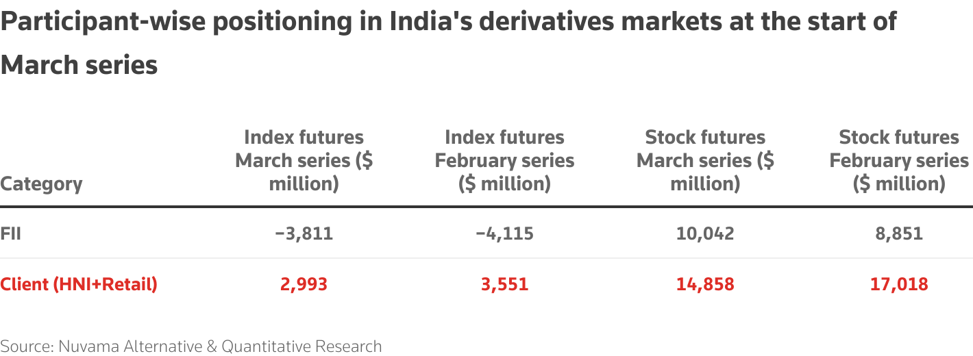 高净值(HNI)个人和散户投资者已减少多头头寸,而外资投资者虽然在股票期货中增加了多头,但用指数空头进行了对冲,IIFL证券和Nuvama替代与量化研究的数据表明。