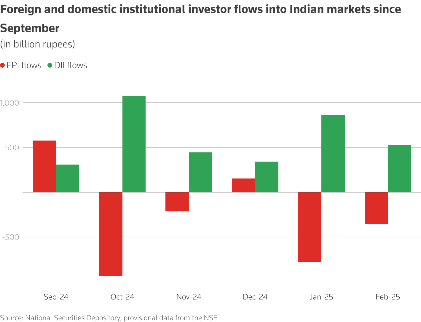 自9月底以来,外国投资者净卖出印度股票约250亿美元,其中2月份为41亿美元。