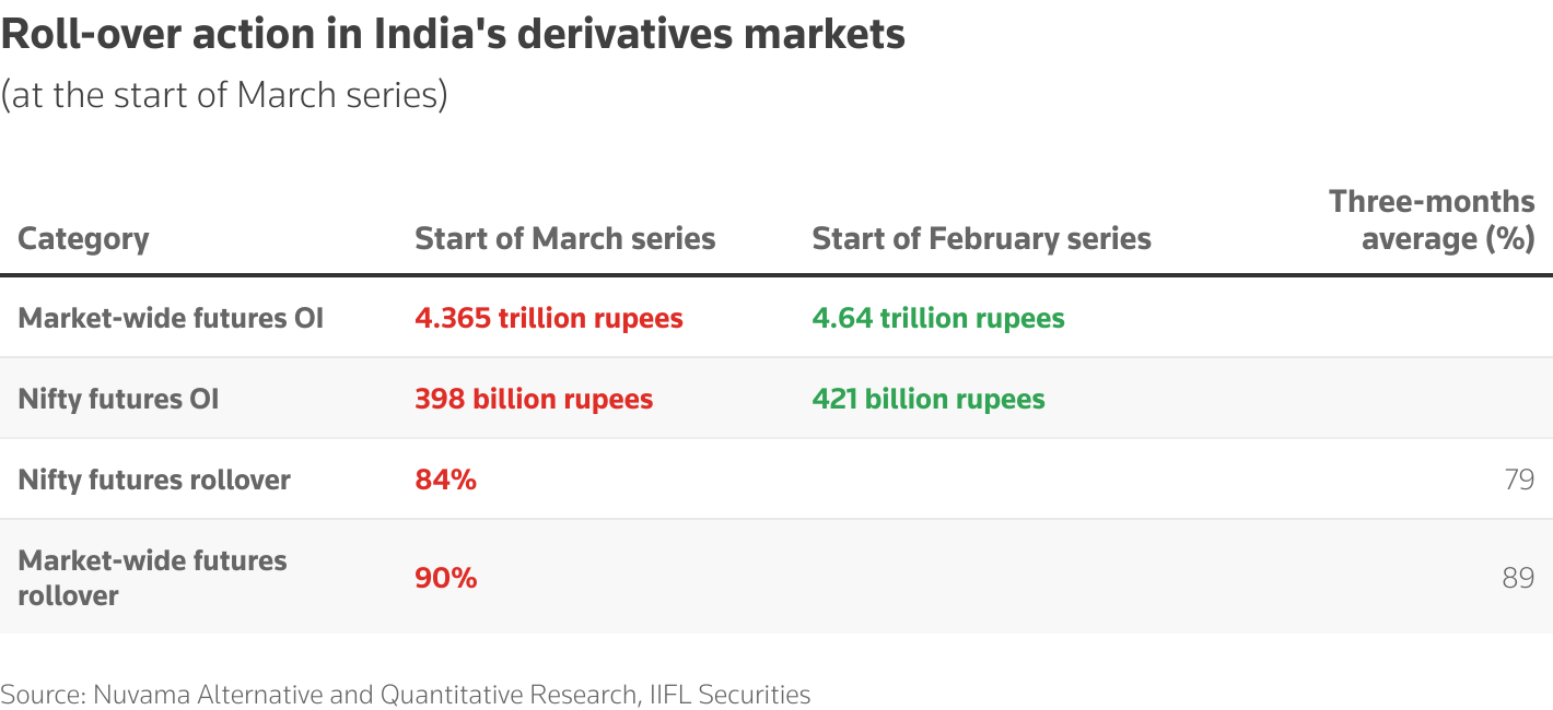未平仓合约(OI),即跟踪未结期货合约的指标,在Nifty 50和更广泛的市场上均有所下降,反映出交易者在进入三月时的信心不足。