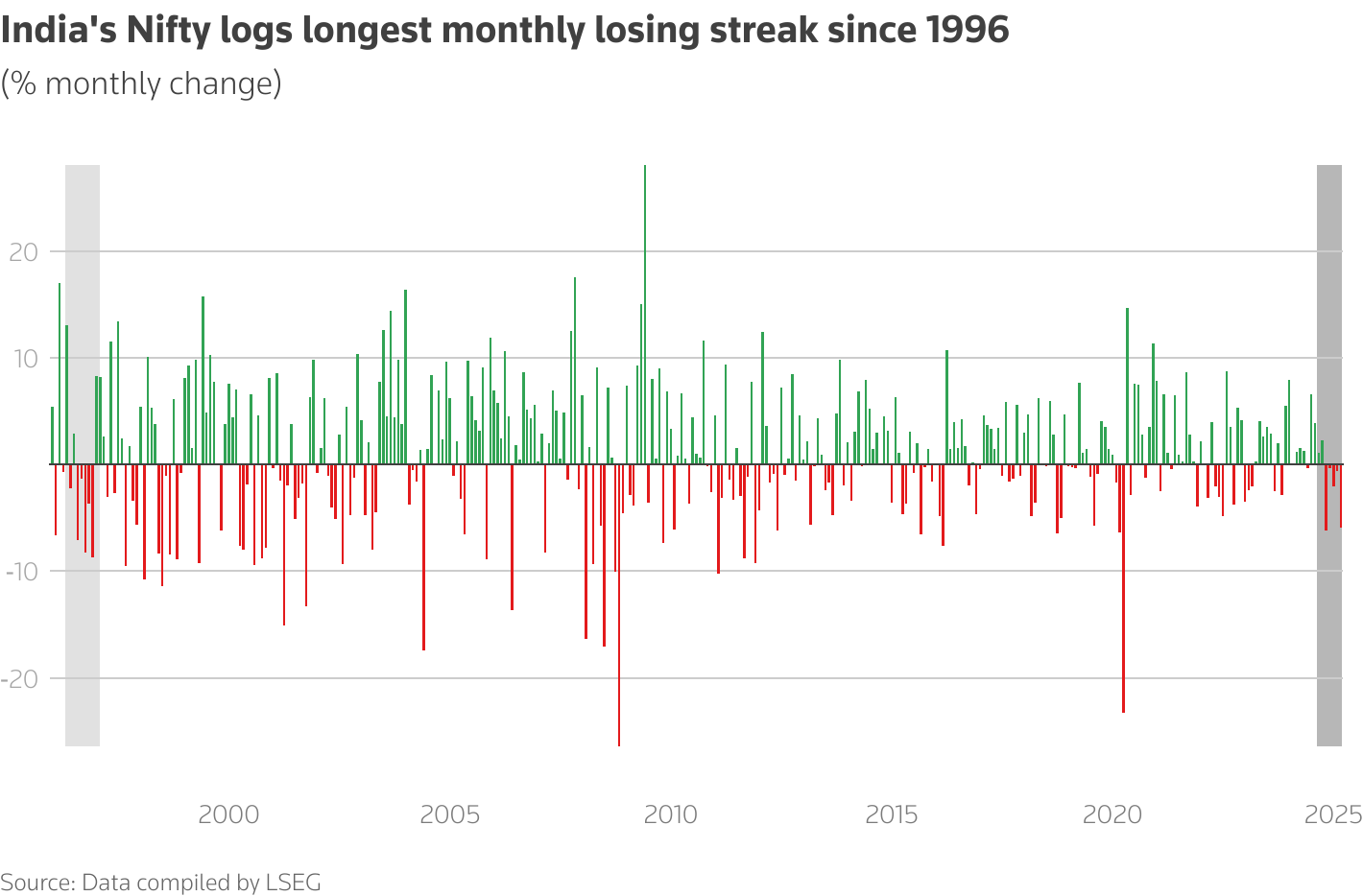 印度的Nifty面临自1996年以来最长的月度亏损周期