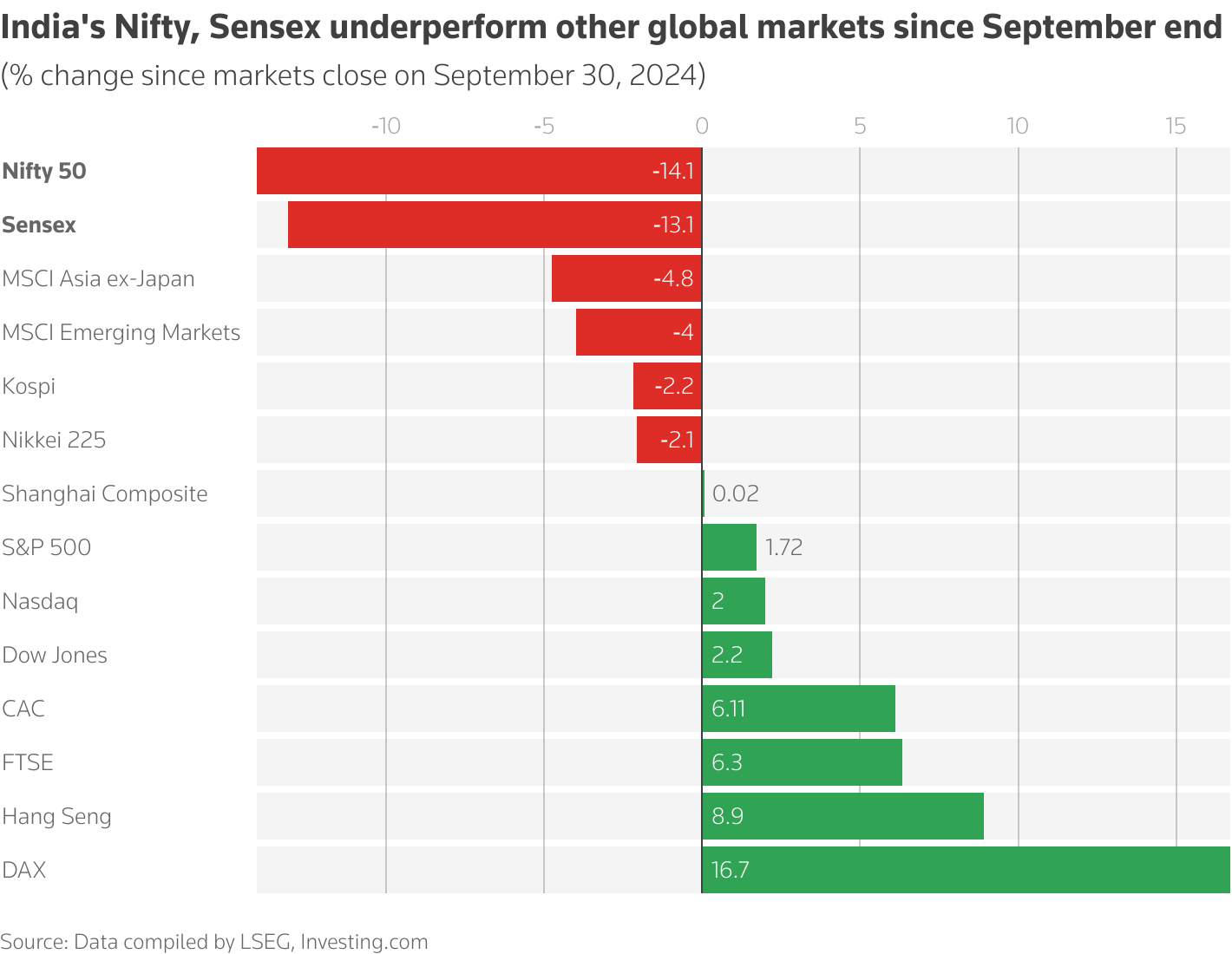 自9月底以来,印度的Nifty和Sensex表现不及其他全球市场