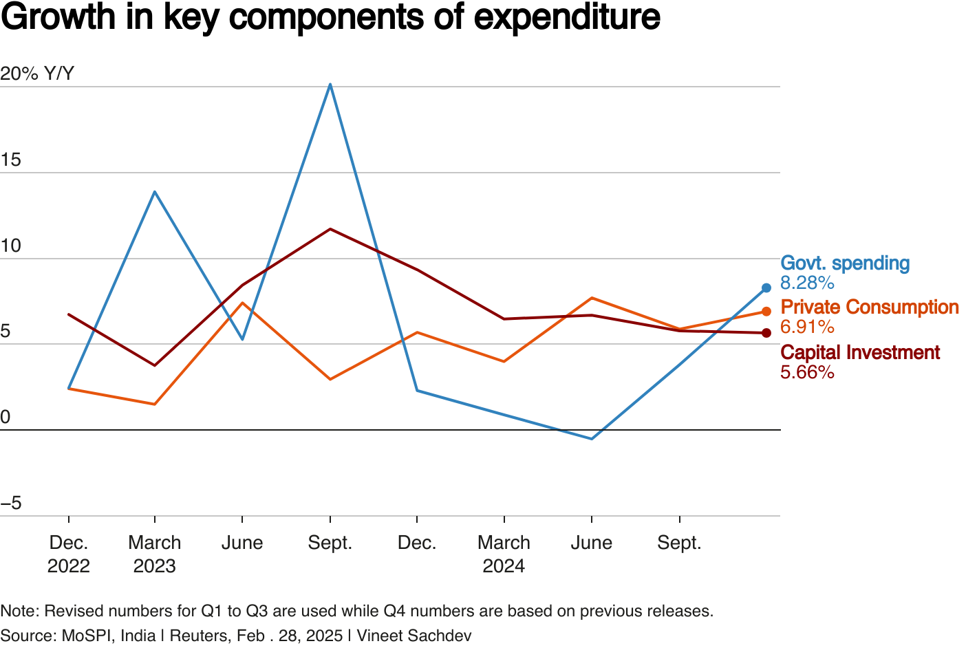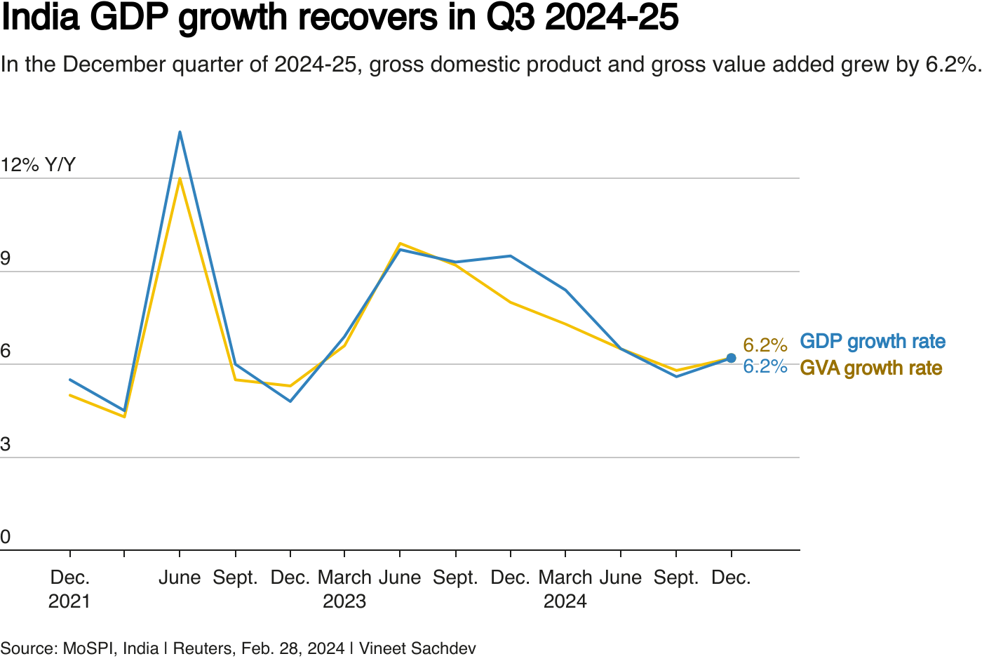印度仍然是世界上增长最快的主要经济体,但它也面临着与美国的贸易不确定性以及特朗普政府计划实施的互惠关税。国内生产总值的增长(INGDPQ=ECI)在十月到十二月的增长略低于分析师在路透社调查中预测的6.3%的扩张,以及中央银行估计的6.8%。经济在上一季度增长了5.6%。增加值(GVA),作为经济活动的一个衡量标准,被视为更稳定的增长指标,在十月到十二月增长了6.2%,相比之下,上一季度的修正扩张为5.8%。