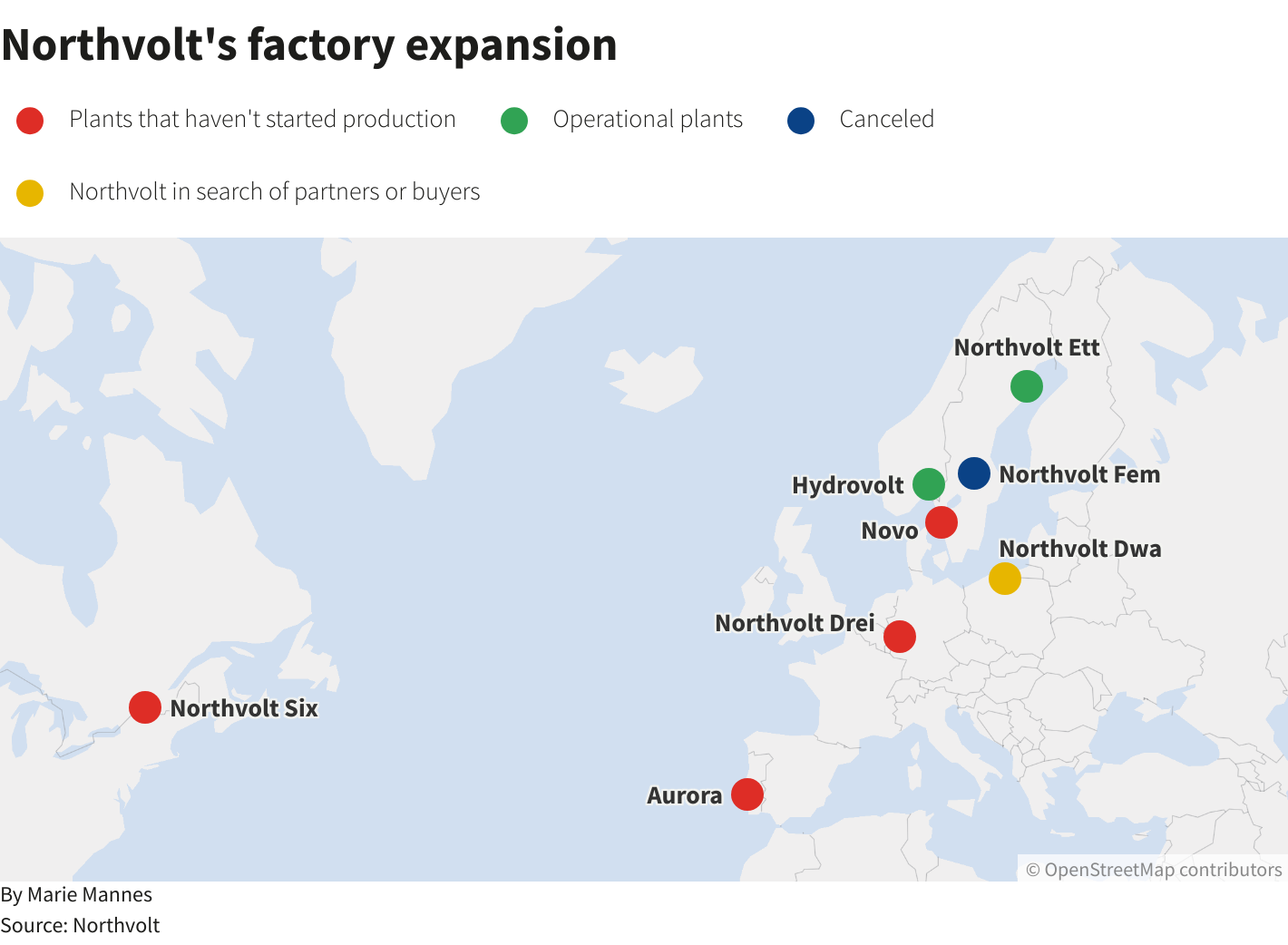 地图显示原始扩展计划,彩色点表示:红色为非运营工厂(Drei, Six),绿色为运营工厂(Ett),黄色为不再由Northvolt融资的工厂(Hydrovolt, NOVO),蓝色为取消或剥离的项目(Fem, Dwa, Aurora)