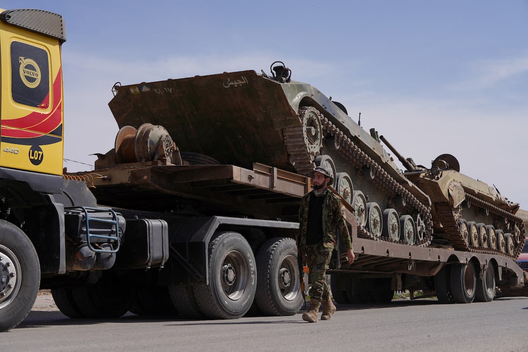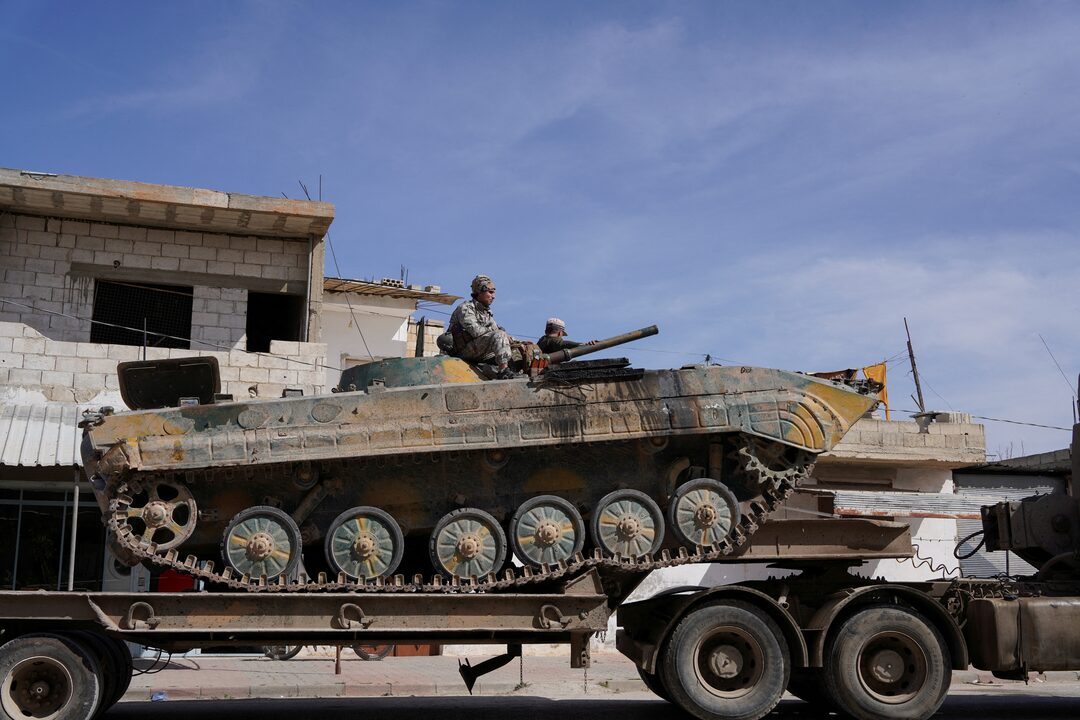 项目1,共5项,叙利亚军队在坦克上坐着,前往叙利亚-黎巴嫩边境,经过与黎巴嫩士兵和武装团体的冲突,地点在叙利亚的Qusayr,2025年3月17日。路透社/Karam al-Masri