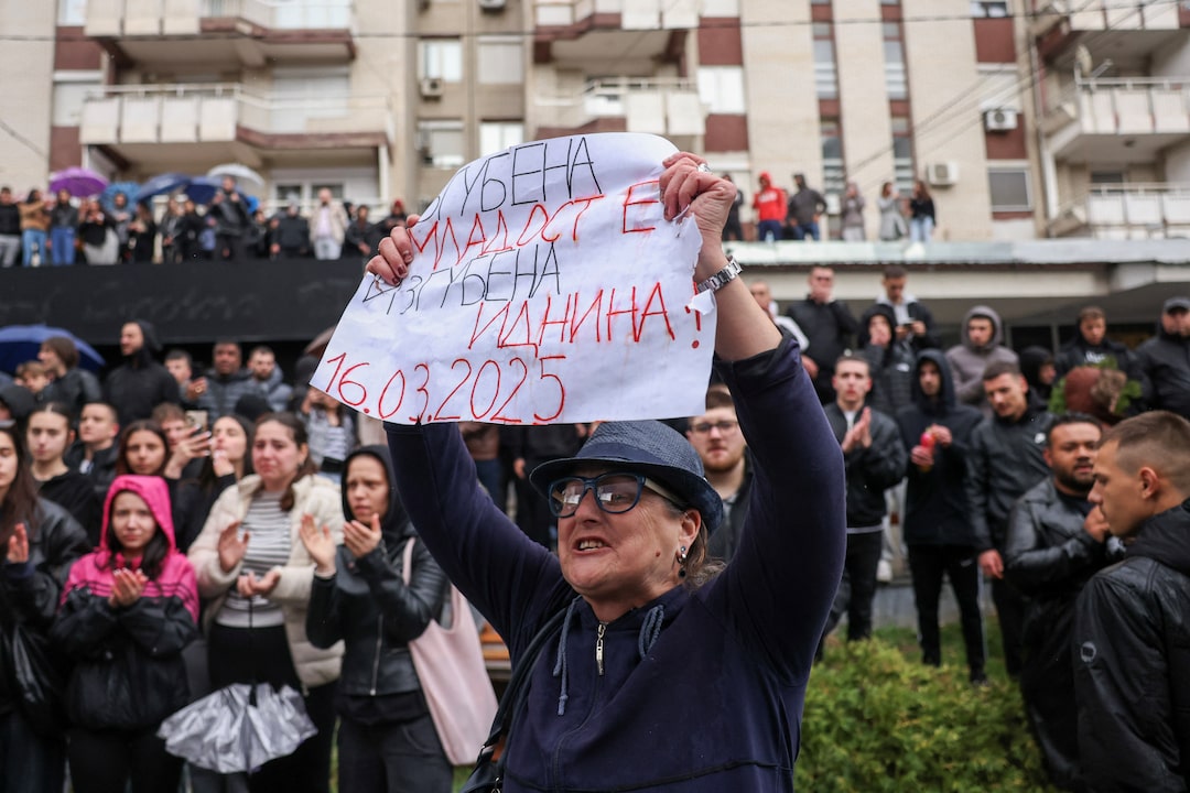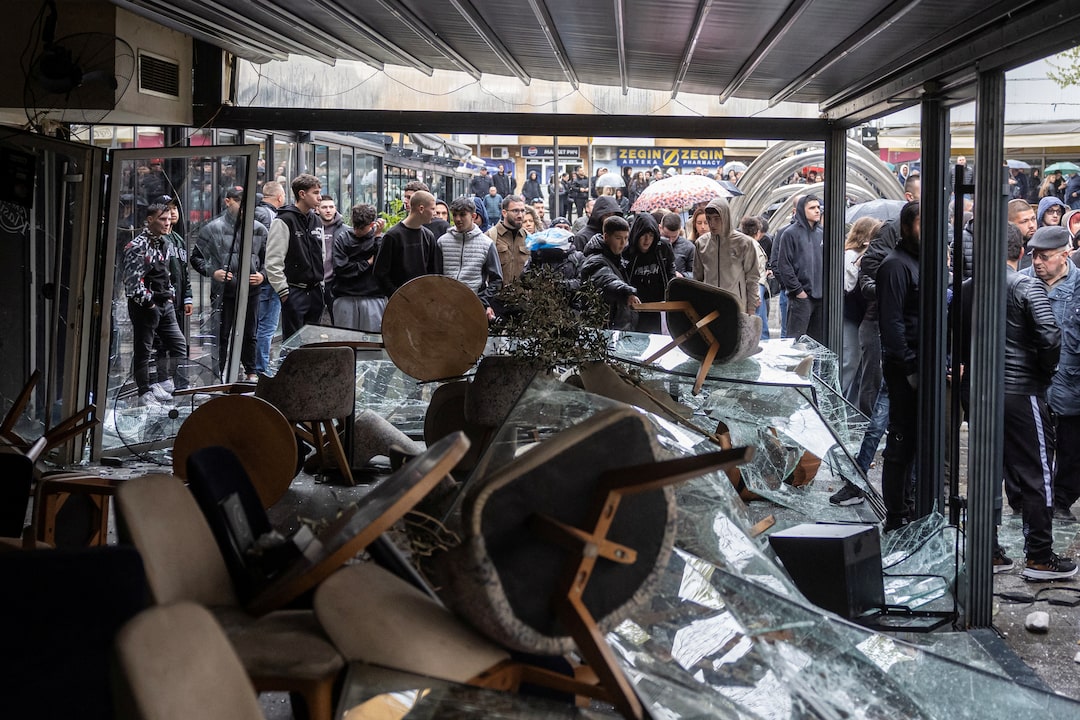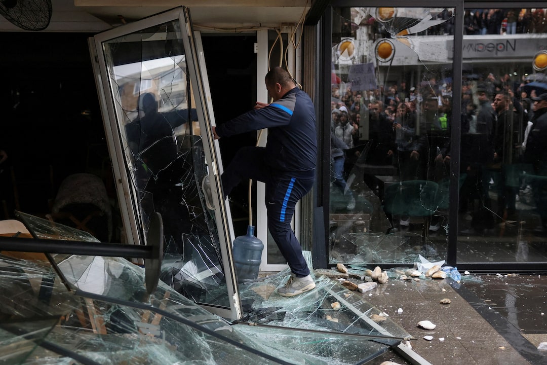 第1项,共15项 人们砸毁了一家酒吧,抗议者称该酒吧属于Pulse夜总会的老板,此前该夜总会发生火灾,导致数十人遇难,地点位于北马其顿的科恰尼镇,2025年3月17日。路透社/马尔科·杜里卡