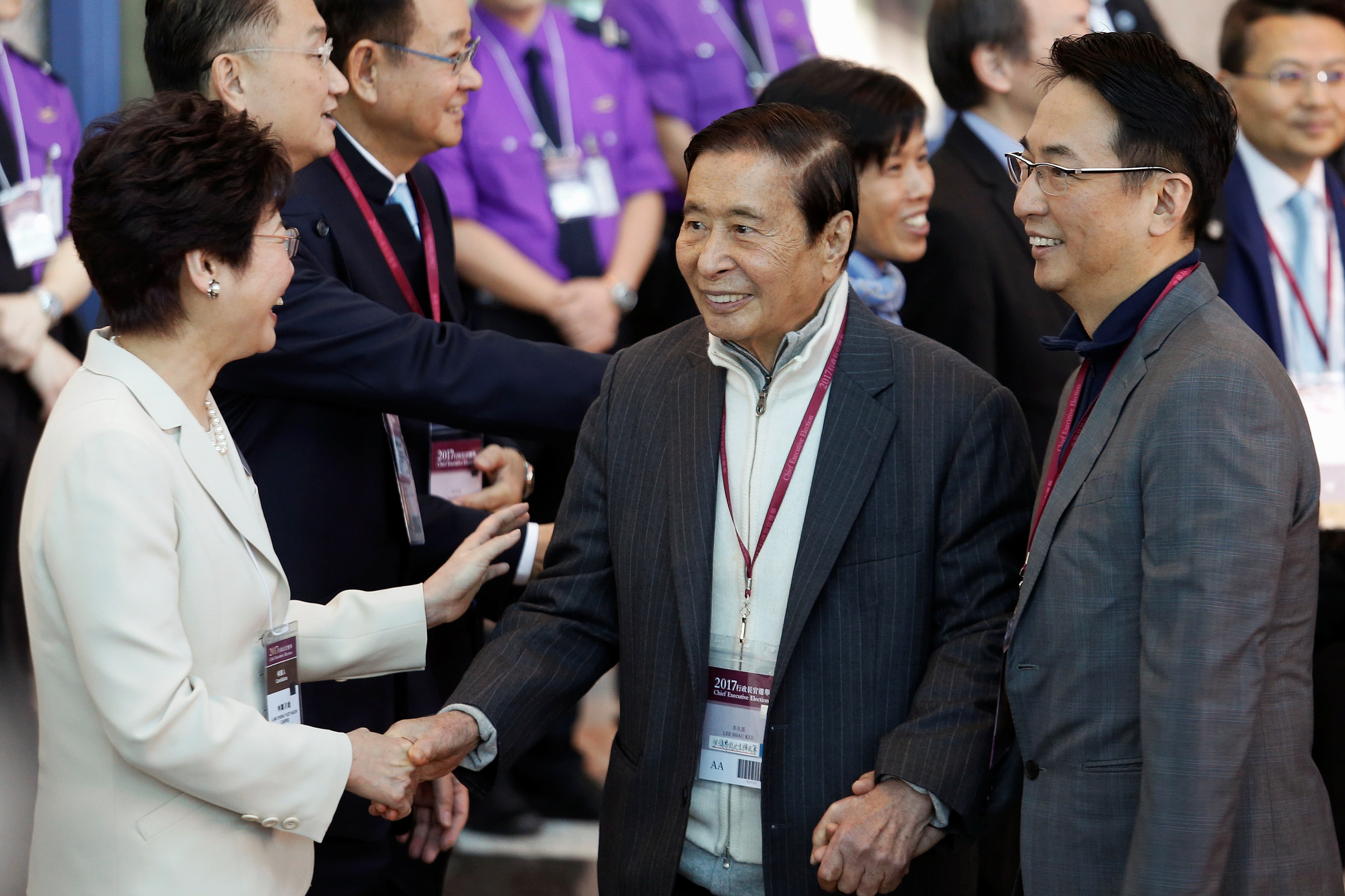 富豪李兆基在2017年3月26日香港特首选举投票前与林郑月娥握手。路透社/鲍比·叶/档案照片香港,3月17日(路透社) - 香港房地产大亨李兆基,城市中最富有的人之一,周一去世,享年97岁。他创办的恒基兆业在一份声明中表示。