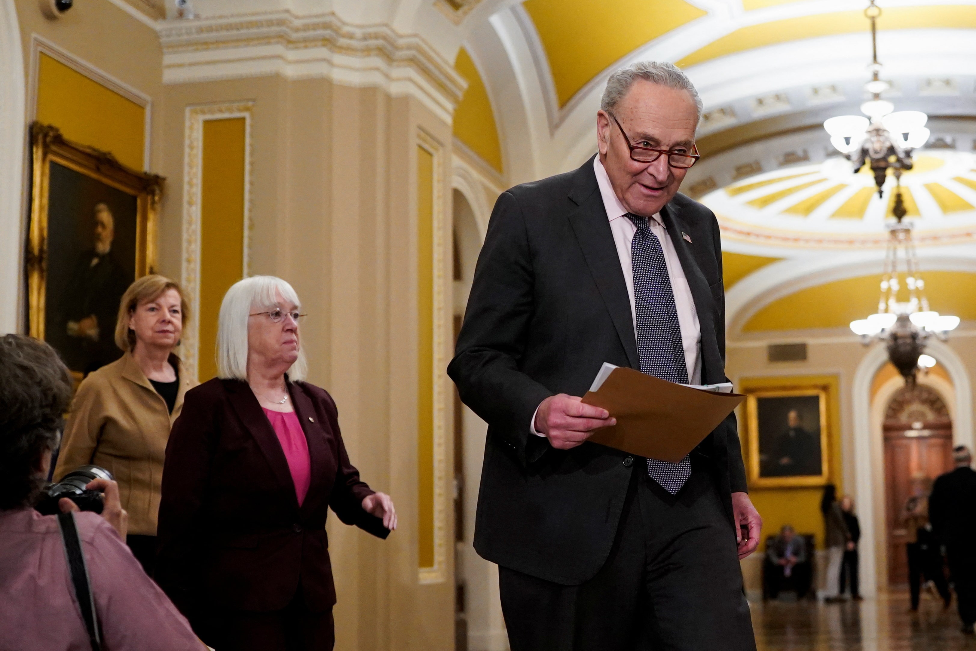 参议院少数党领袖查克·舒默(D-NY)在2025年2月25日美国华盛顿特区国会山参加参议院民主党每周政策午餐的当天走过。华盛顿,3月17日(路透社) - 面对党内反对声浪,顶级参议院民主党人查克·舒默表示他不会阻止一项共和党的支出法案,因此推迟了本周计划的公开活动,出于安全原因,根据他原定出席的多个场所的消息。