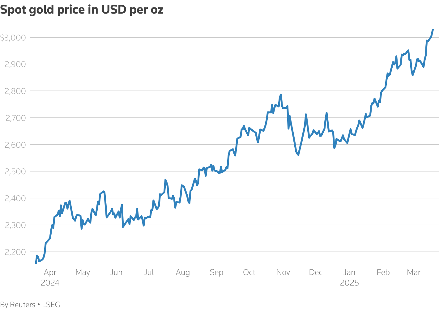 3月18日(路透社) - 黄金价格上涨了1%,在周二触及新高,保持在3000美元以上,因为中东紧张局势加剧以及美国总统唐纳德·特朗普的关税计划引发的不确定性推动了对黄金的需求。
