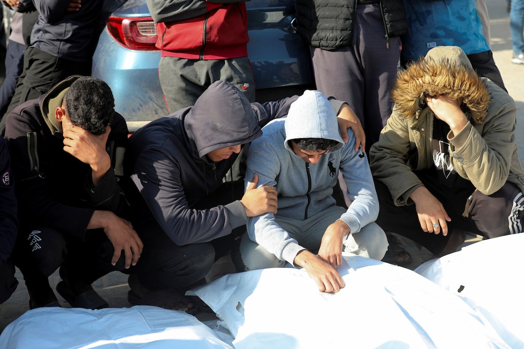 第1项,共2项 哀悼者在阿尔阿克萨烈士医院旁对以色列空袭中遇难的巴勒斯坦人遗体作出反应,地点位于加沙地带中部的德尔阿尔巴拉赫,2025年3月18日。路透社/拉马丹·阿贝德