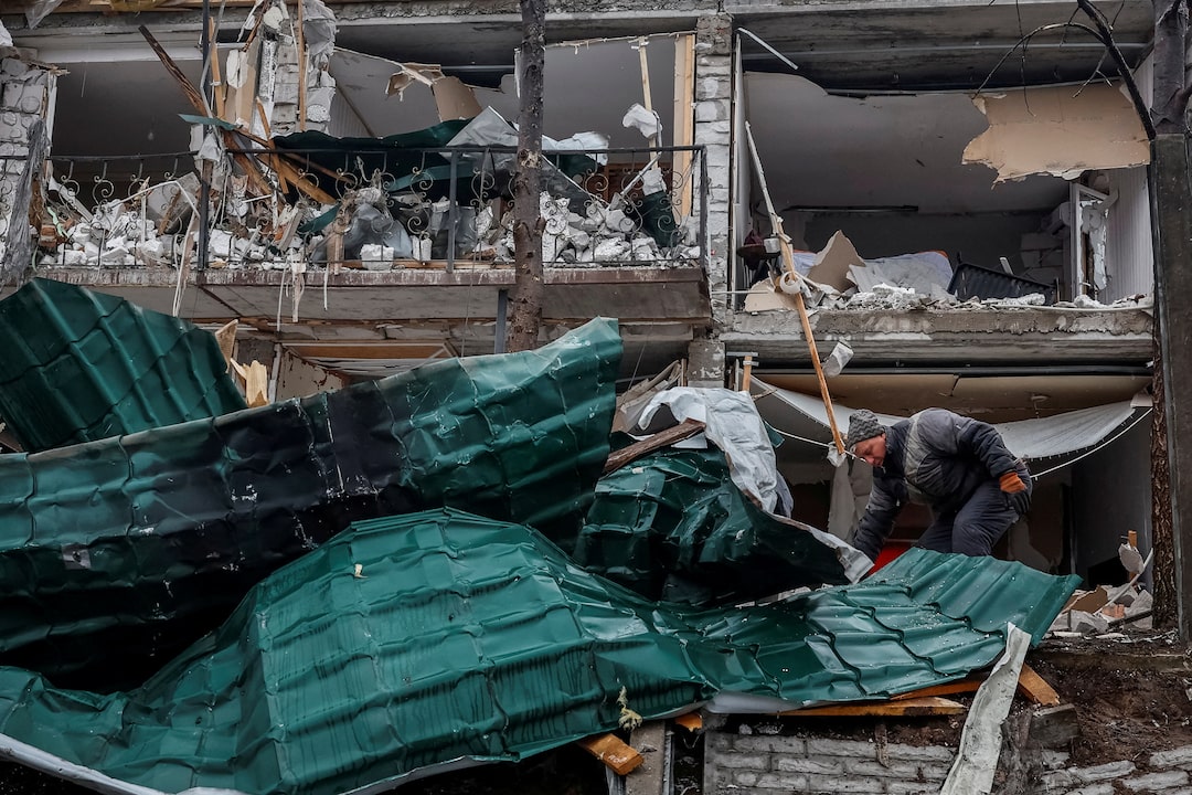 第1项,共7项 一名男子在乌克兰基辅地区霍斯托梅尔镇的俄罗斯无人机袭击现场清理废墟,正值俄罗斯对乌克兰的攻击,2025年3月19日。路透社/阿丽娜·斯穆特科