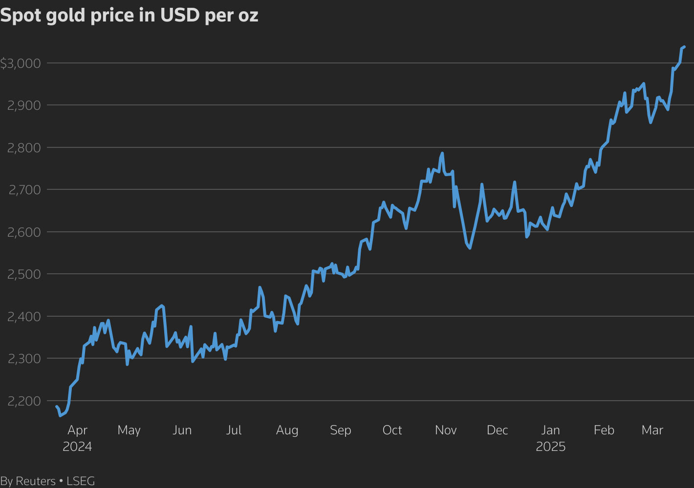 * 到格林威治标准时间1604时,现货黄金价格保持在每盎司3,034.12美元不变,此前在交易中触及3,045.24美元的历史最高点,这是今年的第15个峰值。美国黄金期货上涨0.1%,至3,042.9美元。