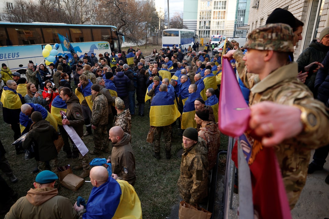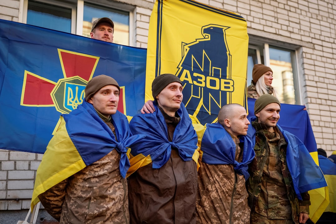 13名被包裹在国旗中的乌克兰战俘(POWs)在交换后摆姿势返回,背景是俄罗斯对乌克兰的攻击,地点在乌克兰的一个未公开地点,2025年3月19日。路透社/阿丽娜·斯穆特科