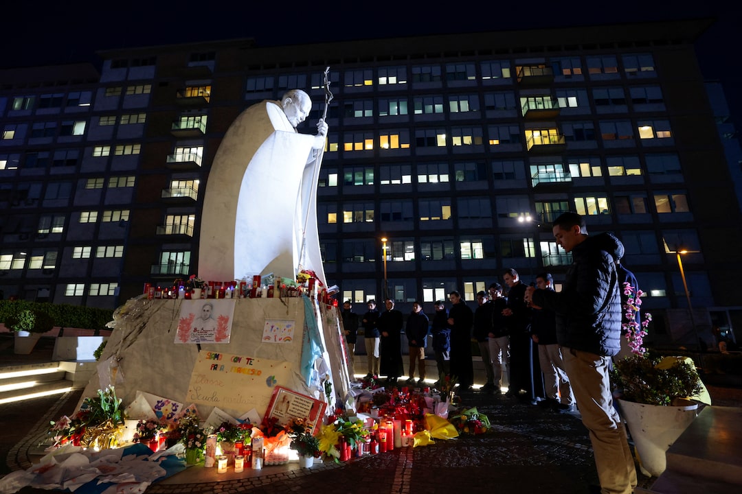 第1项,共5项 一个人在教皇方济各继续住院的当天,在梵蒂冈圣彼得广场举行的祈祷服务上,手持教皇方济各的图像,日期为2025年3月19日。路透社/古利尔莫·曼贾帕内
