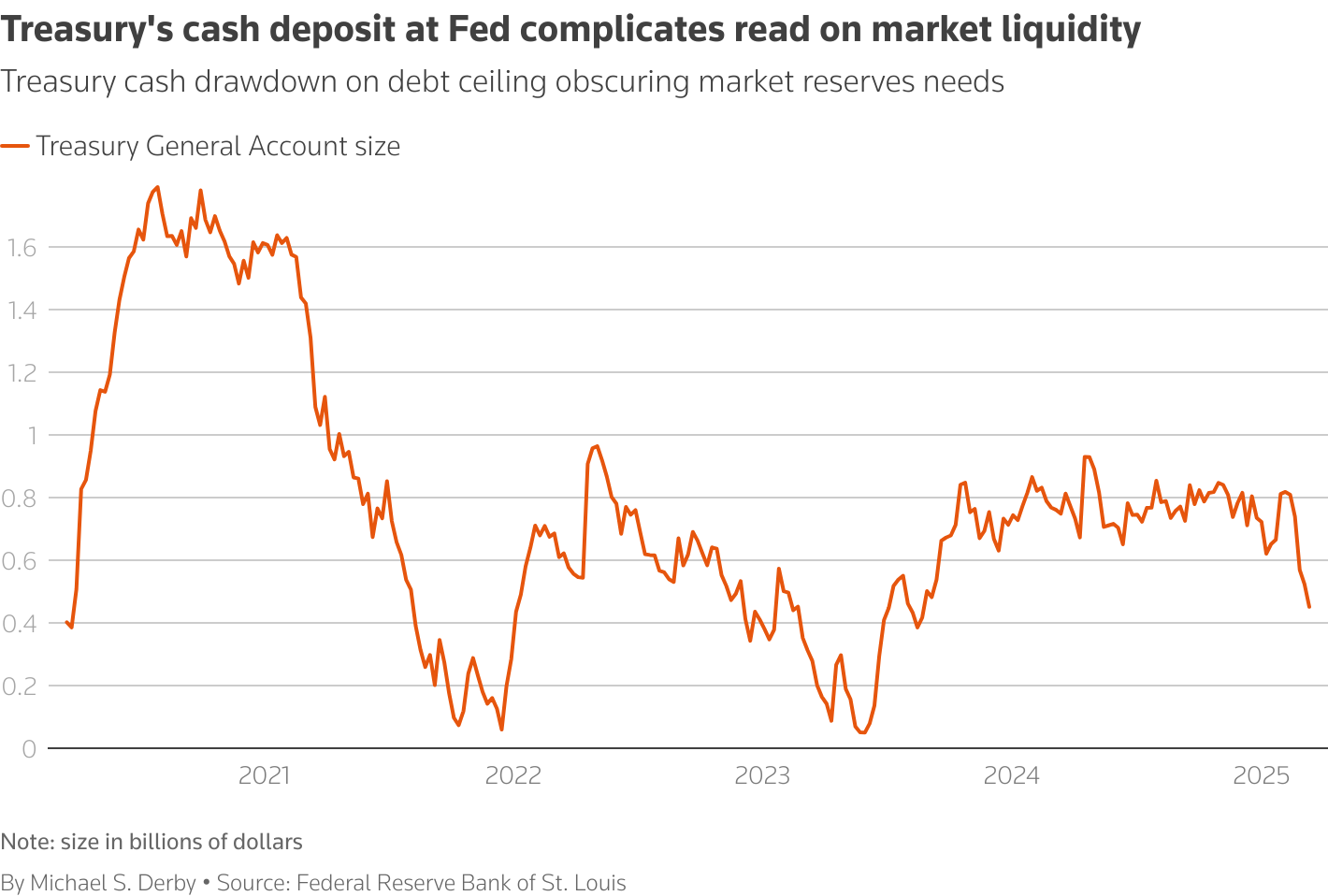 财政部在美联储的现金存款使市场流动性解读变得复杂,财政部在债务上限上的现金支出模糊了市场储备需求
