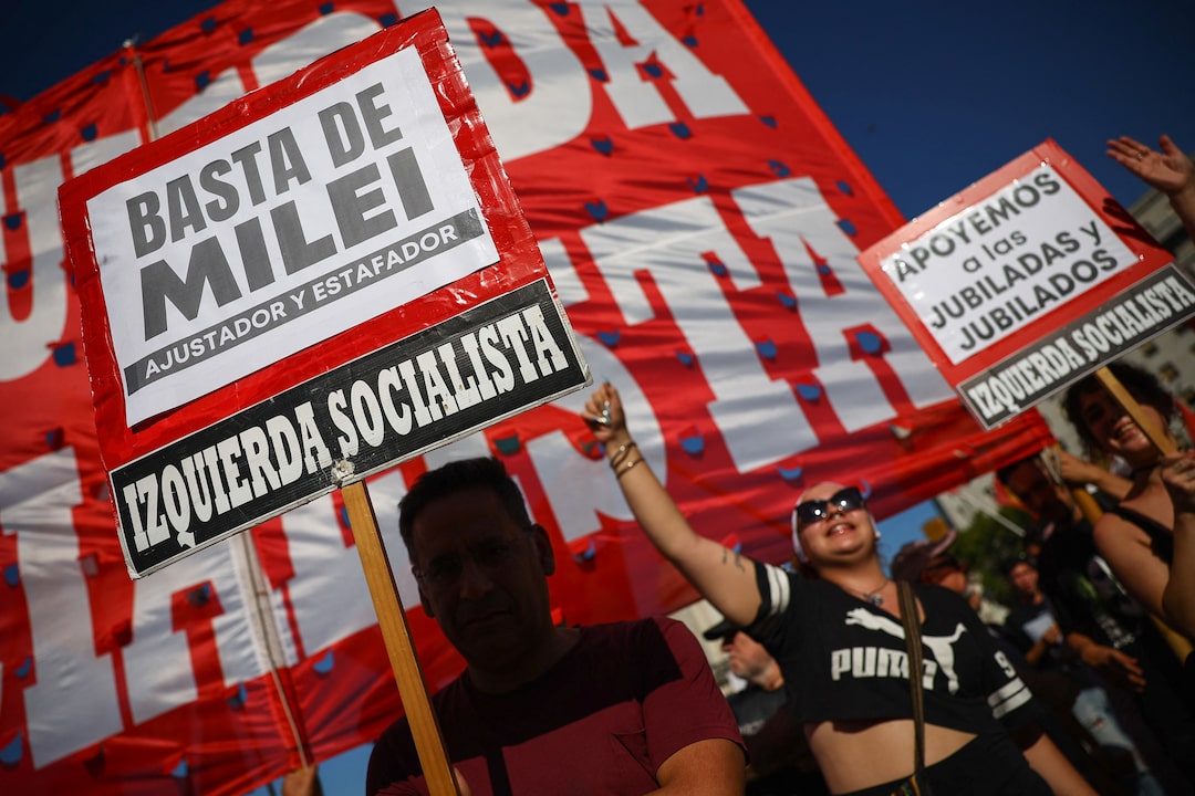 成千上万的反对党、工会和社会组织的活动人士聚集在布宜诺斯艾利斯市中心的国会周围,抗议米莱自2023年底上任以来实施的养老金削减。