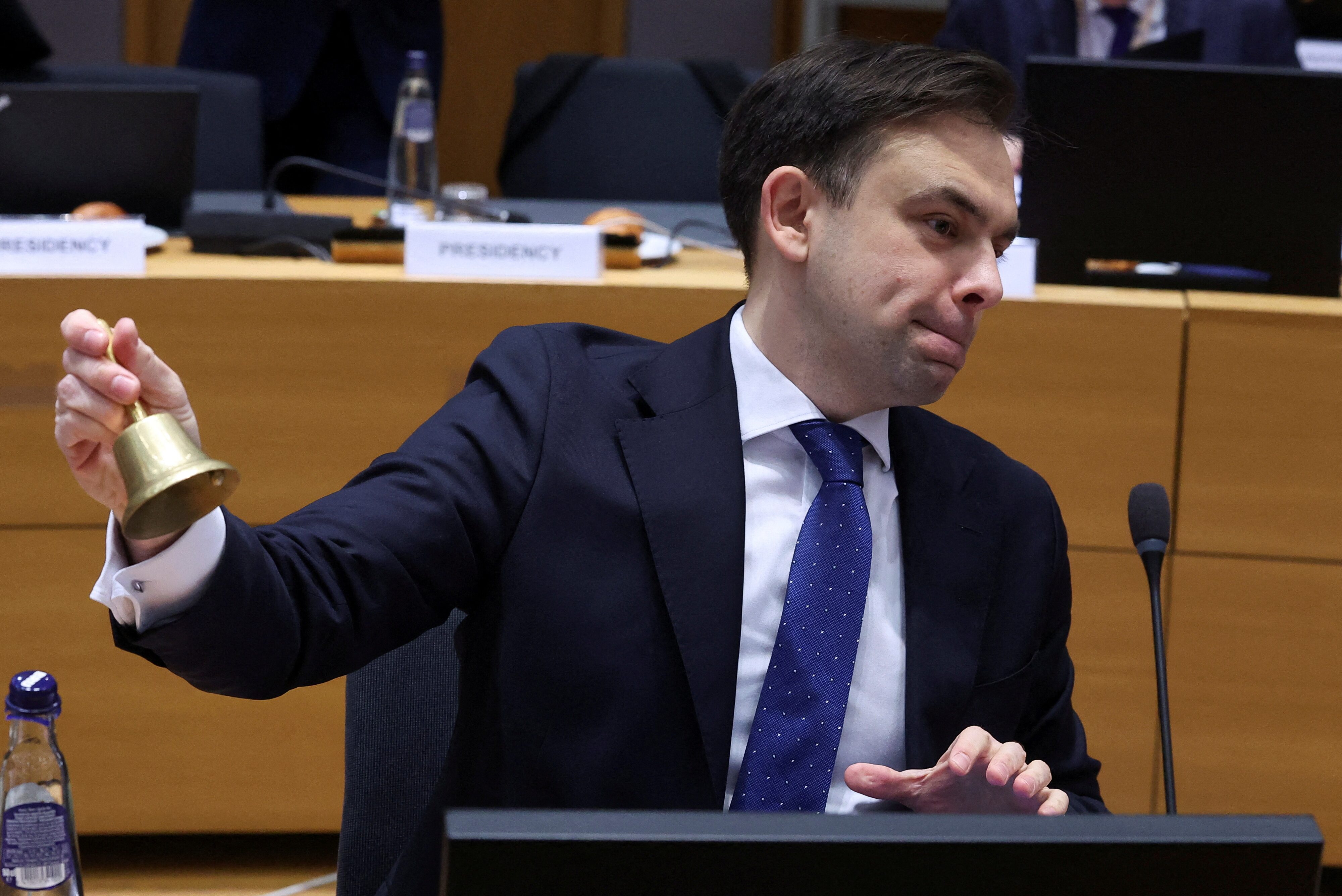 波兰财政部长安杰伊·多曼斯基在2025年2月18日于比利时布鲁塞尔召开的欧盟财政部长会议上敲响钟声。路透社/伊夫·赫尔曼/档案照片2025年3月20日(路透社)- 波兰正在与英国和欧洲国家讨论合作方式,以提高国防生产,同时为纳税人获得更好的价值,财政部长安杰伊·多曼斯基在周四接受《金融时报》采访时表示。