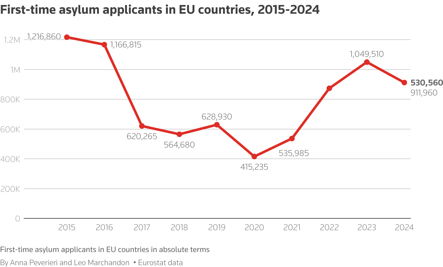 Eurostat报告称,来自非欧盟公民的首次庇护请求在欧盟27个成员国中达到了912,000个,低于2023年的100多万。