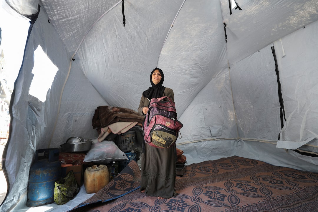 第1项,共2项 流离失所的巴勒斯坦妇女胡达·朱奈德在她的帐篷内收拾物品,准备与家人逃离,因为以色列军队在加沙北部的贾巴利亚发布了多个社区的撤离命令,随后发生了猛烈的以色列空袭,时间是2025年3月19日。路透社/马哈茂德·伊萨