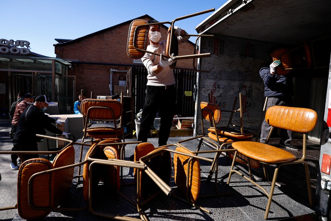 在首都关闭的餐厅里,他的工人团队堆放椅子、烤箱、储物柜和烘焙推车,使用叉车将一些设备装上车辆运走,而在一个地点,一名采购员则搬走了桌子。